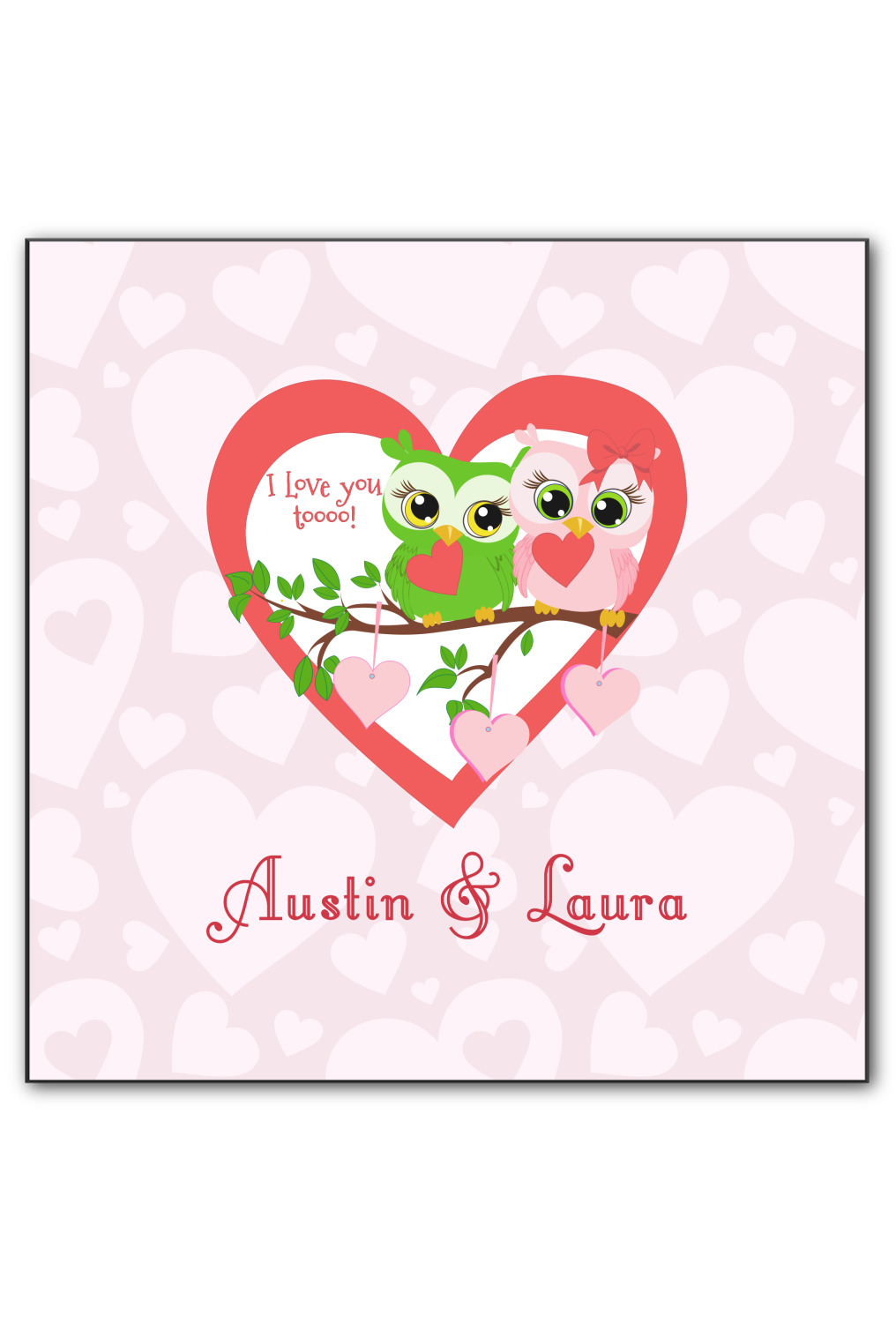 This sweet design, complete with adorable owls hooting to each other, "I love you toooooo!," is sure to make her heart melt. With white hearts on a pale pink background, it is just perfect for Valentine's Day.