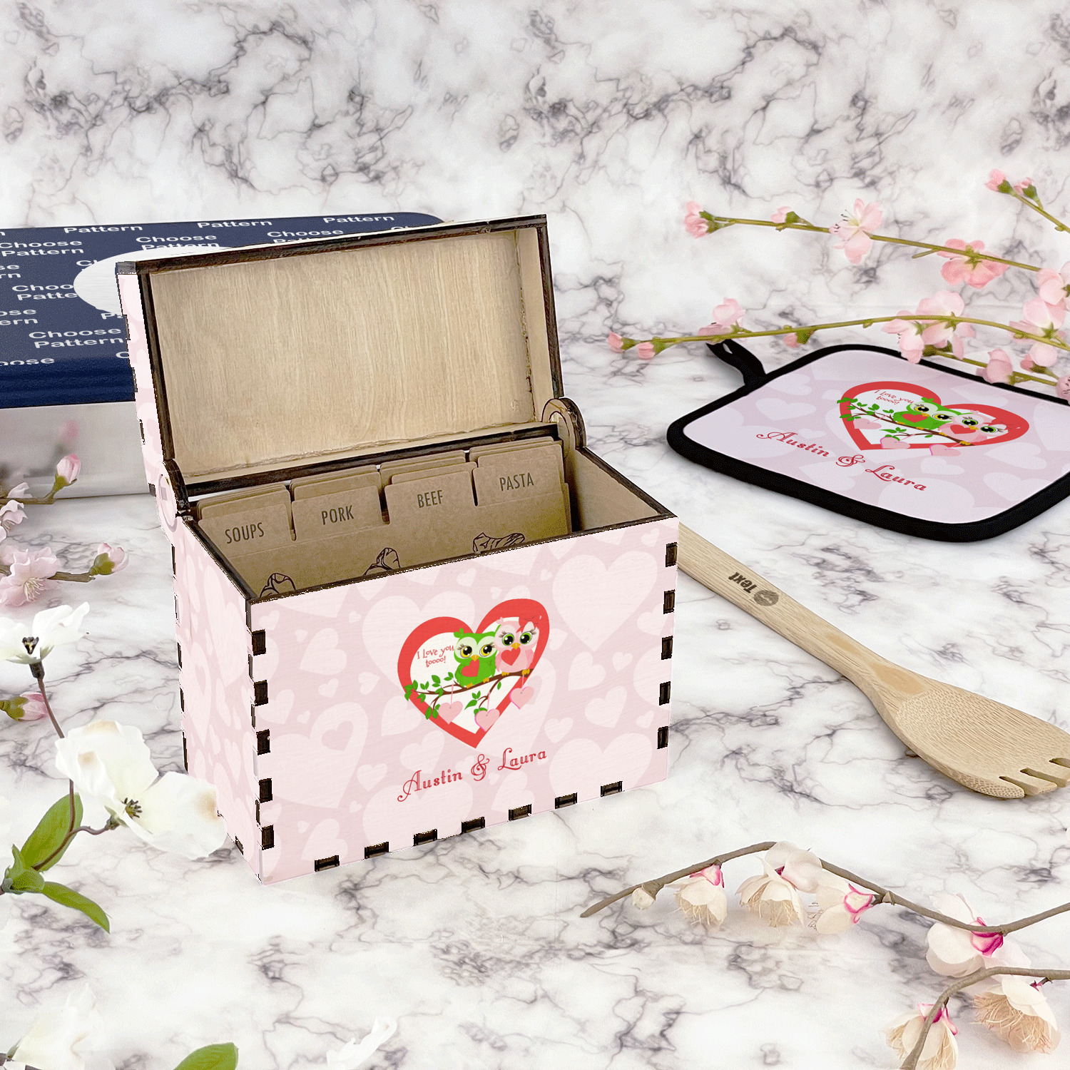 Using our design library you can design your recipe box to be personalized just for you. We will then laser engrave it and assemble it and have it ready for you to insert your recipe cards when you recieve it.