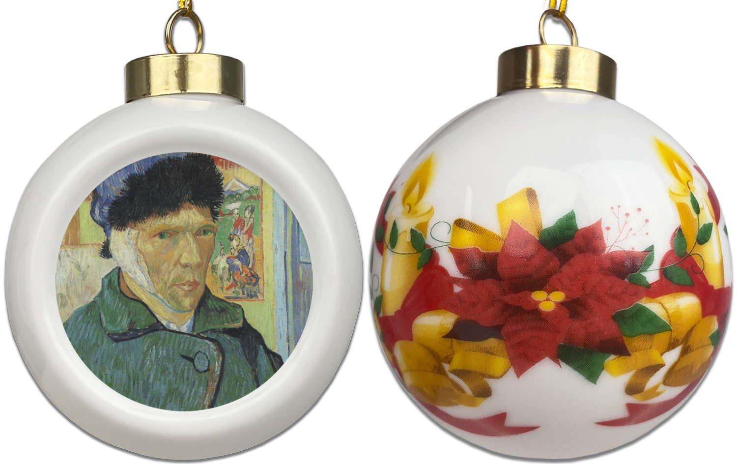 Our Christmas ornaments are a unique ceramic ball shape with a twist as it has a flat face to display your custom design! Select from one of our two design types - Christmas Tree or Poinsettia Garland - to adorn the curved back of your personal design. Each ornament measures 3H x 2.5W x 2D accompanied with a gold string accent for finishing touches to hang on your beautiful Christmas tree!