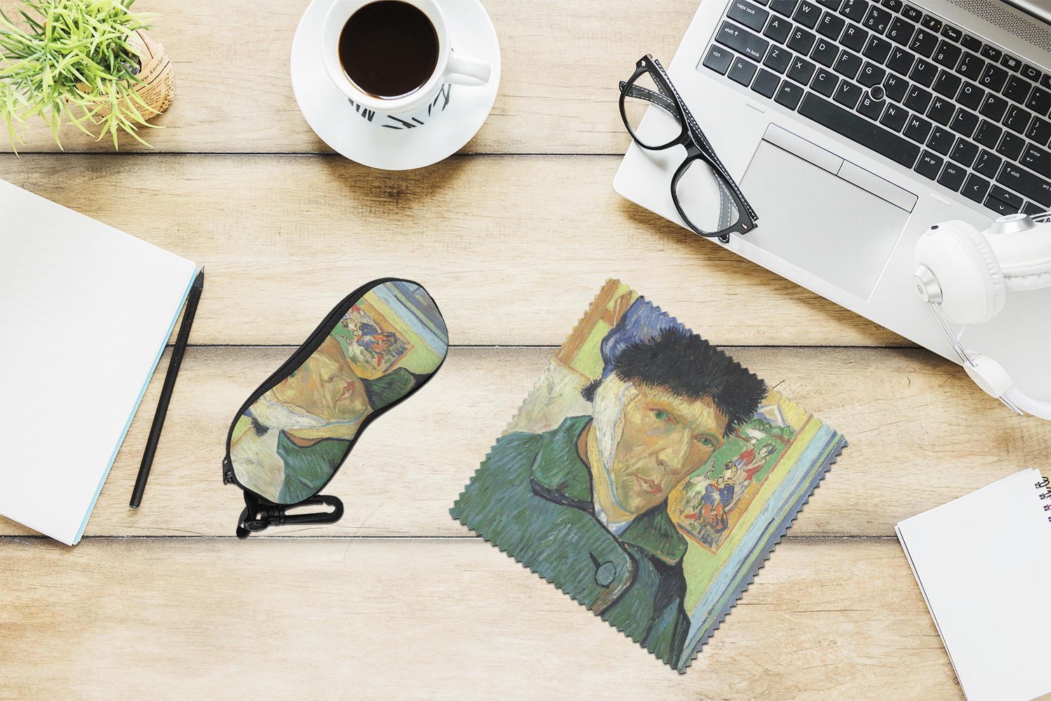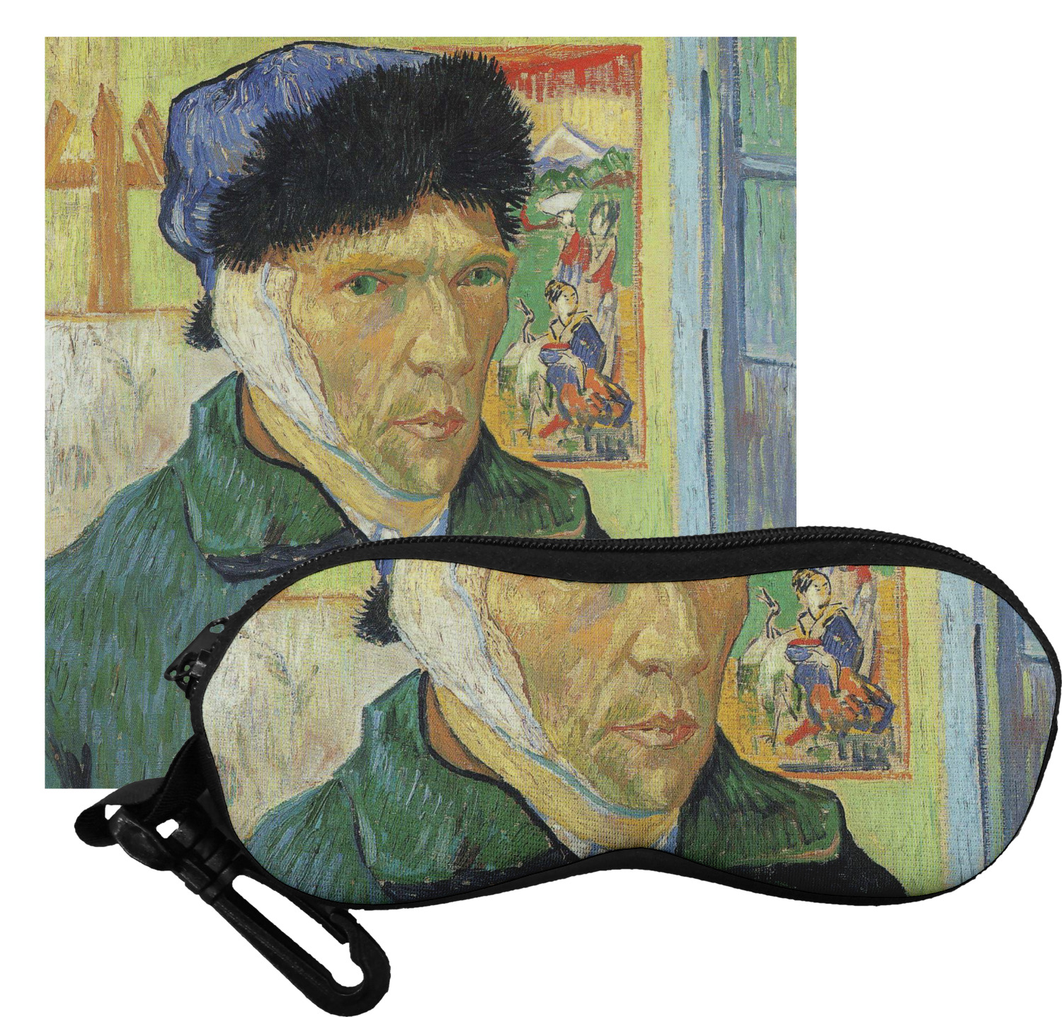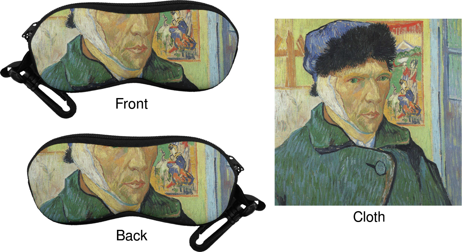 The cases have the design on both sides, a black zipper, and clips for hanging on a belt buckle or purse strap and also include matching lens cloths.
