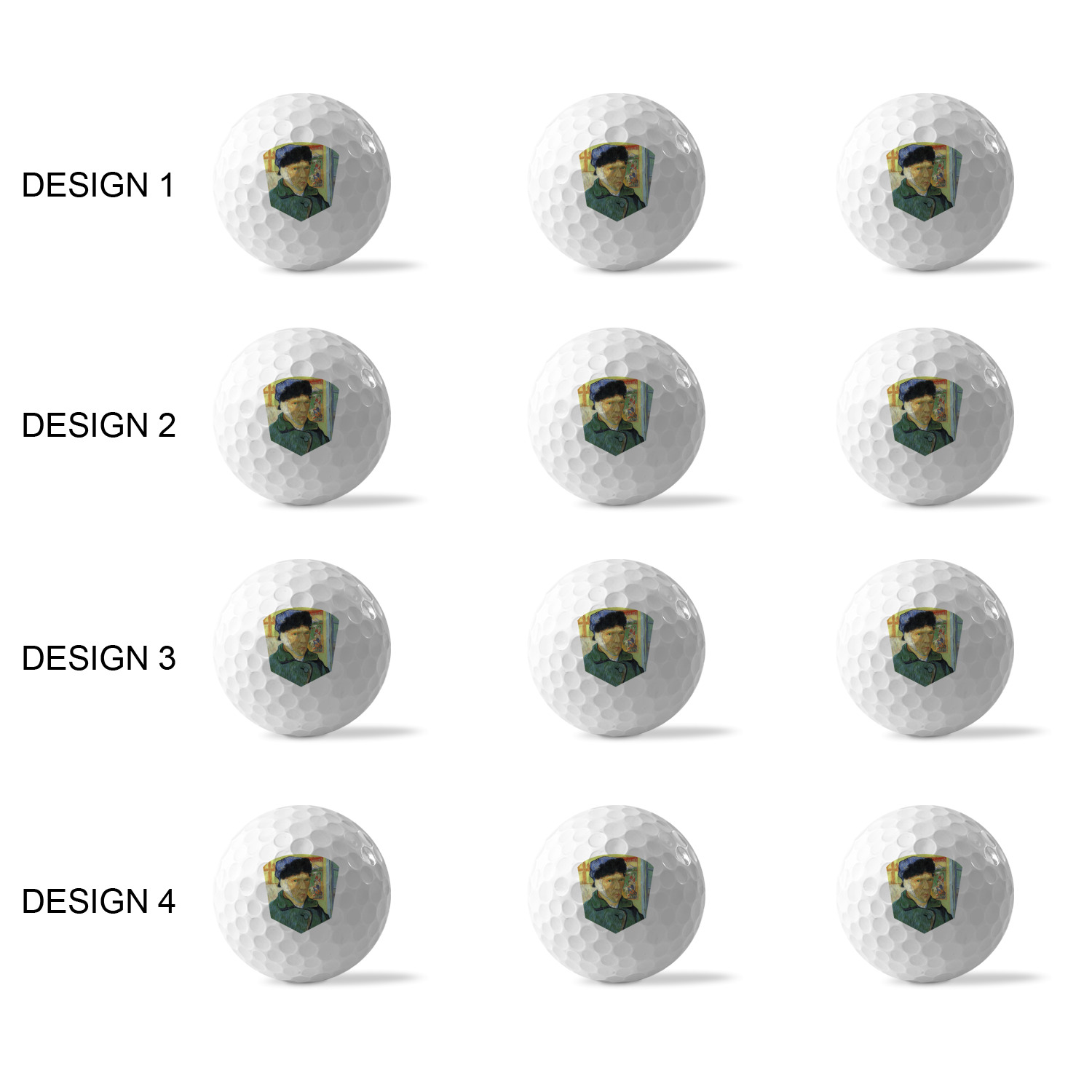 Printed in a 7/8" circle on each ball, you can customize these with our design studio or use your own designs. For a set of 3 you can design each one individually, for a set of 12 you will be able to use 4 unique designs and will receive 3 balls with each design.