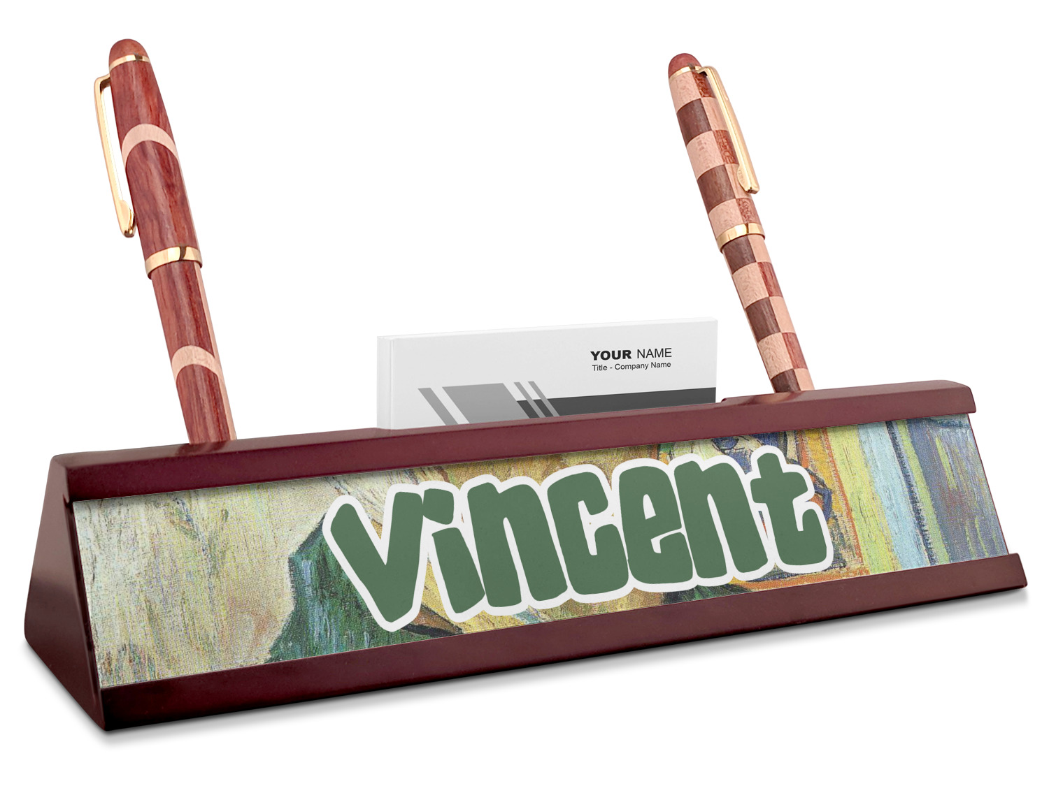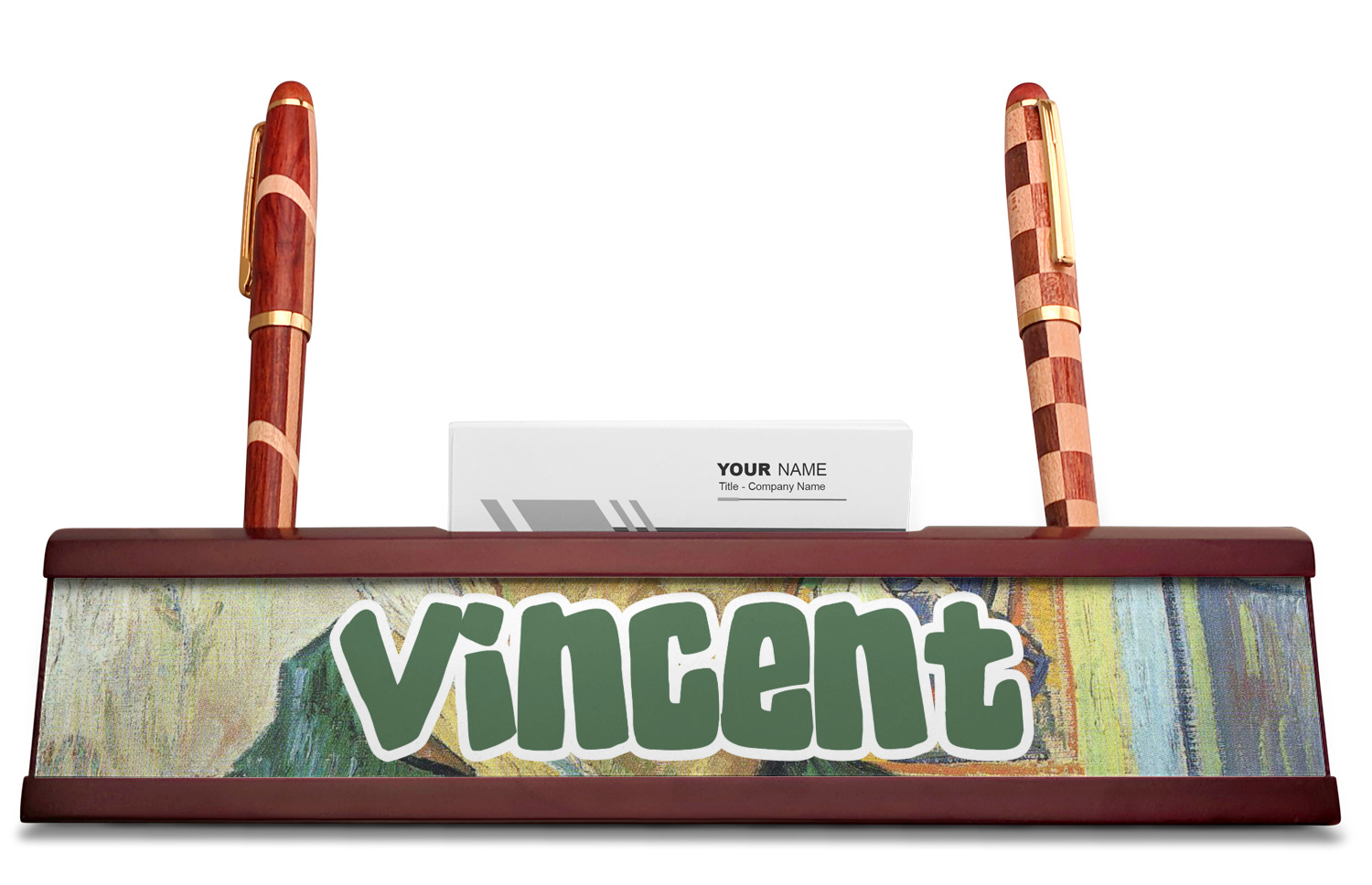 Your desk name plates are crafted from a high-quality, dark-cherry mahogany. At approximately 9.5 by 1.875 by 2.5 inches, this name plaque will fit perfectly, front and center, on your desk. Your customization spans across the entire face of the nameplate. Behind the nameplate lies a skinny slot that can fit approximately 15, traditionally-sized, business cards. You can also store your writing utensils on either side of this custom desk name plate.