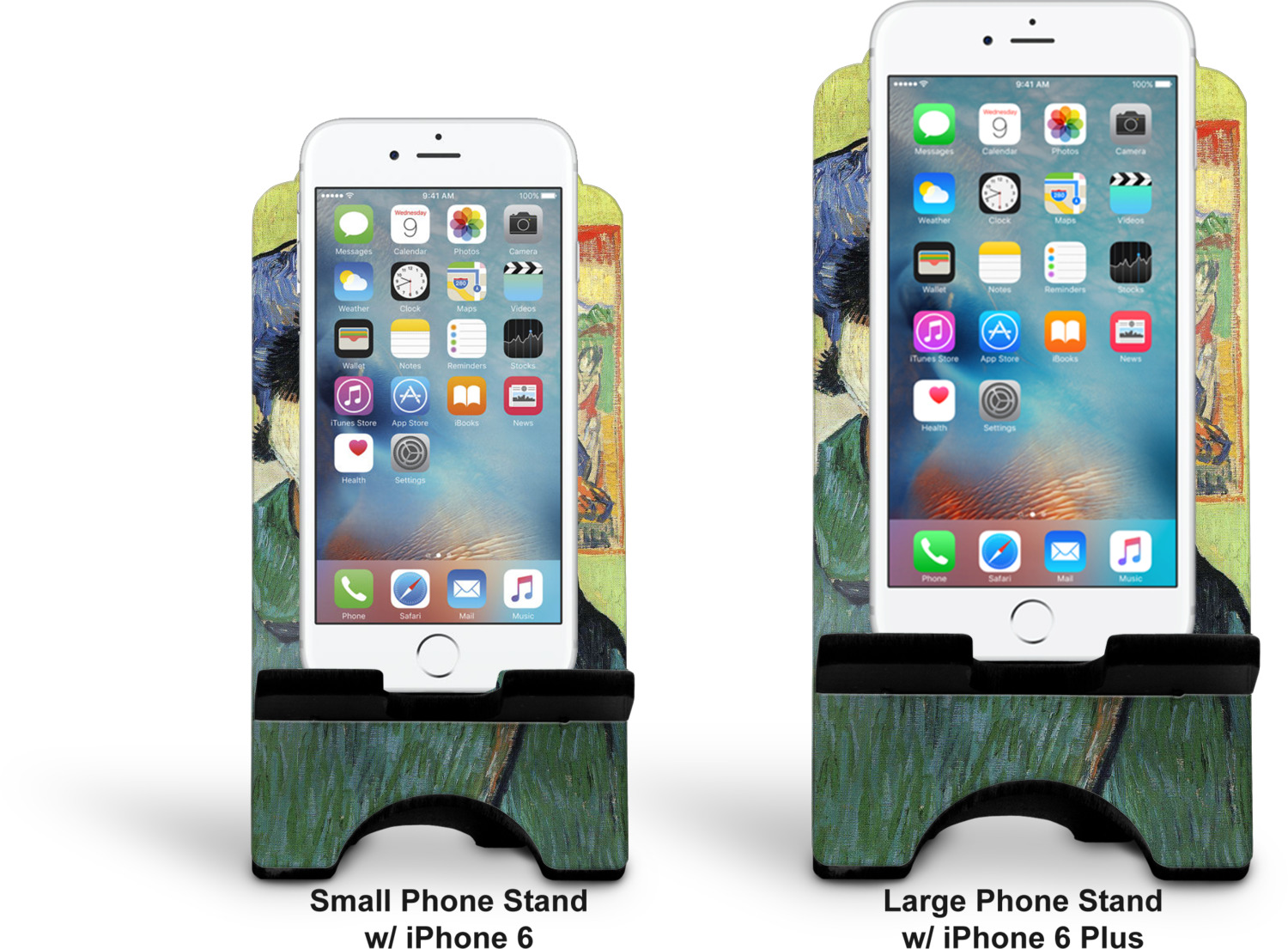 To meet your needs, we offer four variations of this IPhone stand. The backboard of the first version is shaped as a plain, yet sleek rectangle, and is available in two sizes. Our smaller size is approximately 4 by 3.25 by 7 inches, while the larger model is 4 by 3.77 by 8.5 inches. Alongside this model, we also provide you with a more decorative option. The upper part of our second version features a curved edge, for a classy, suave appearance. This phone holder is also sold in two sizes: a smaller version, which is 4 by 3.25 by 7 inches, and our larger model, which is 4 by 3.77 by 8.5 inches. Both models will support large phones, but the larger model is better if you wish to proudly display your personalized design.