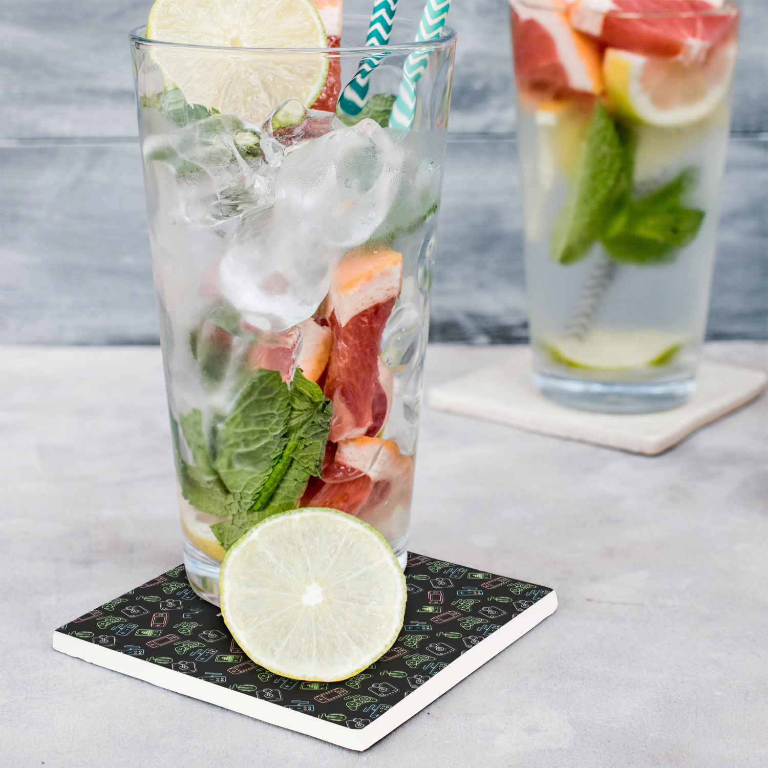 These customized stone coasters are perfect for use with beverages that are served in drinkware that "sweat". When cocktails, sodas, iced tea, water, etc. are served with ice in a regular glasses (non insulated glasses), they release condensation that drips down the outside of the glasses.