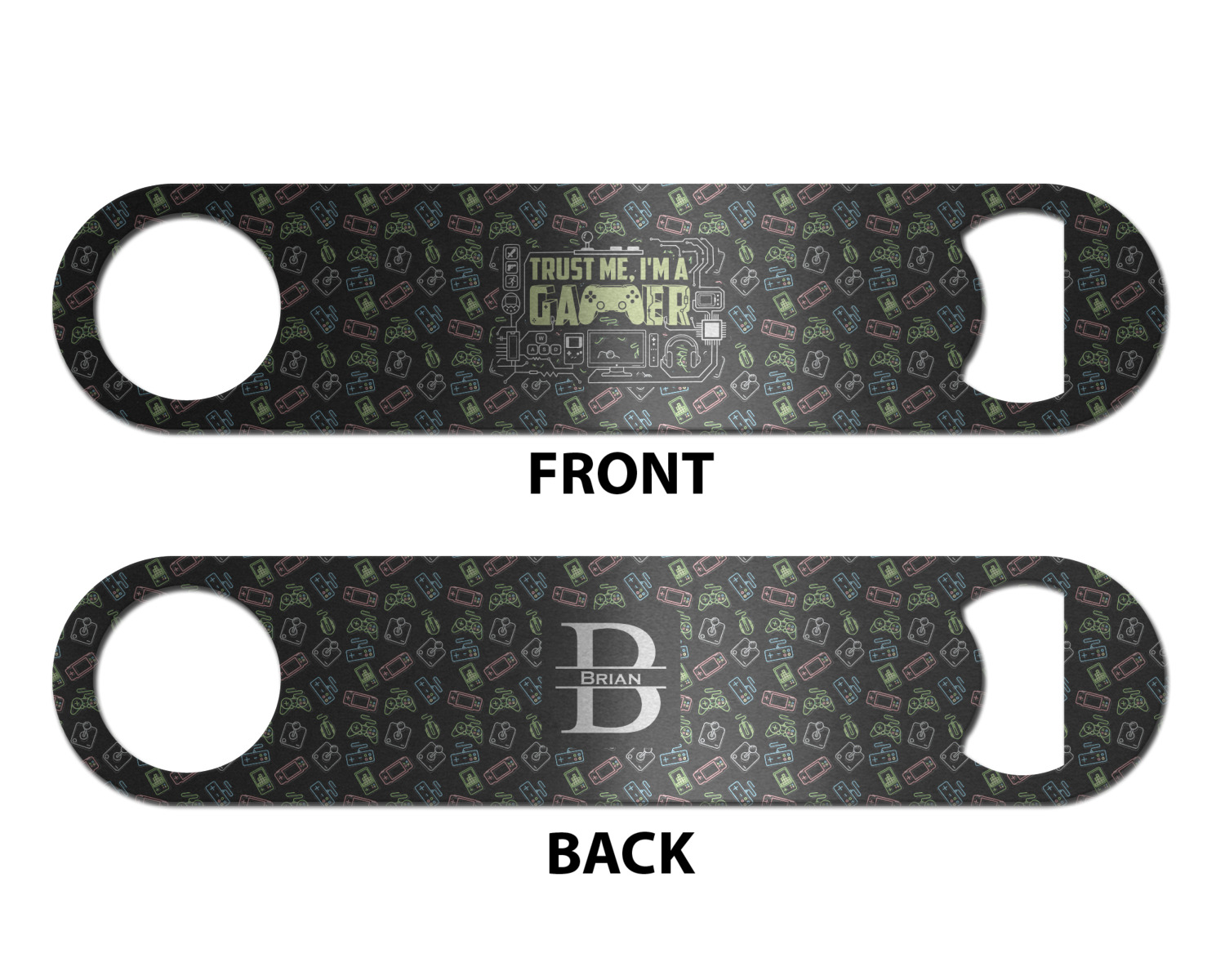 Made from stainless steel, these beer bottle openers are 7 by 1.625 inches, giving you plenty of leverage when trying to open a stubborn bottle. On one end of this personalized bottle opener, you'll find a circular hole for you to hang and display your opener. On the opposite end, you'll find the tool used for opening bottles. This opener in particular has the same structure and style as professional bartender bottle openers. Your customization is sublimated onto both the back and front, and both sides can be customized individually. Choose from one of our two base colors - white or silver.