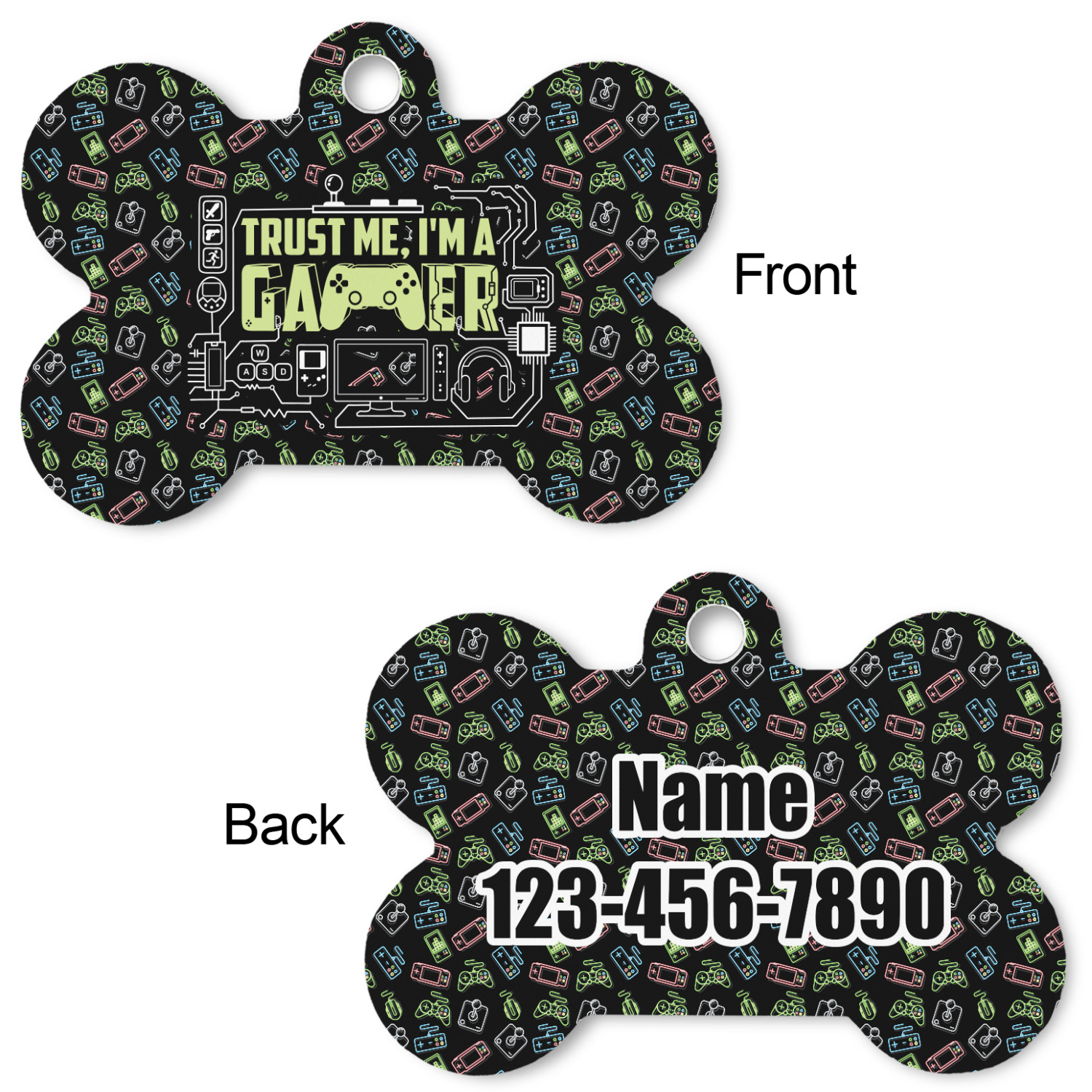 Our default design templates print your dog's personalization on the front and your contact information on the back; however everything is customizable, so you customize the patterns, the colors, the personalization, the contact information etc.