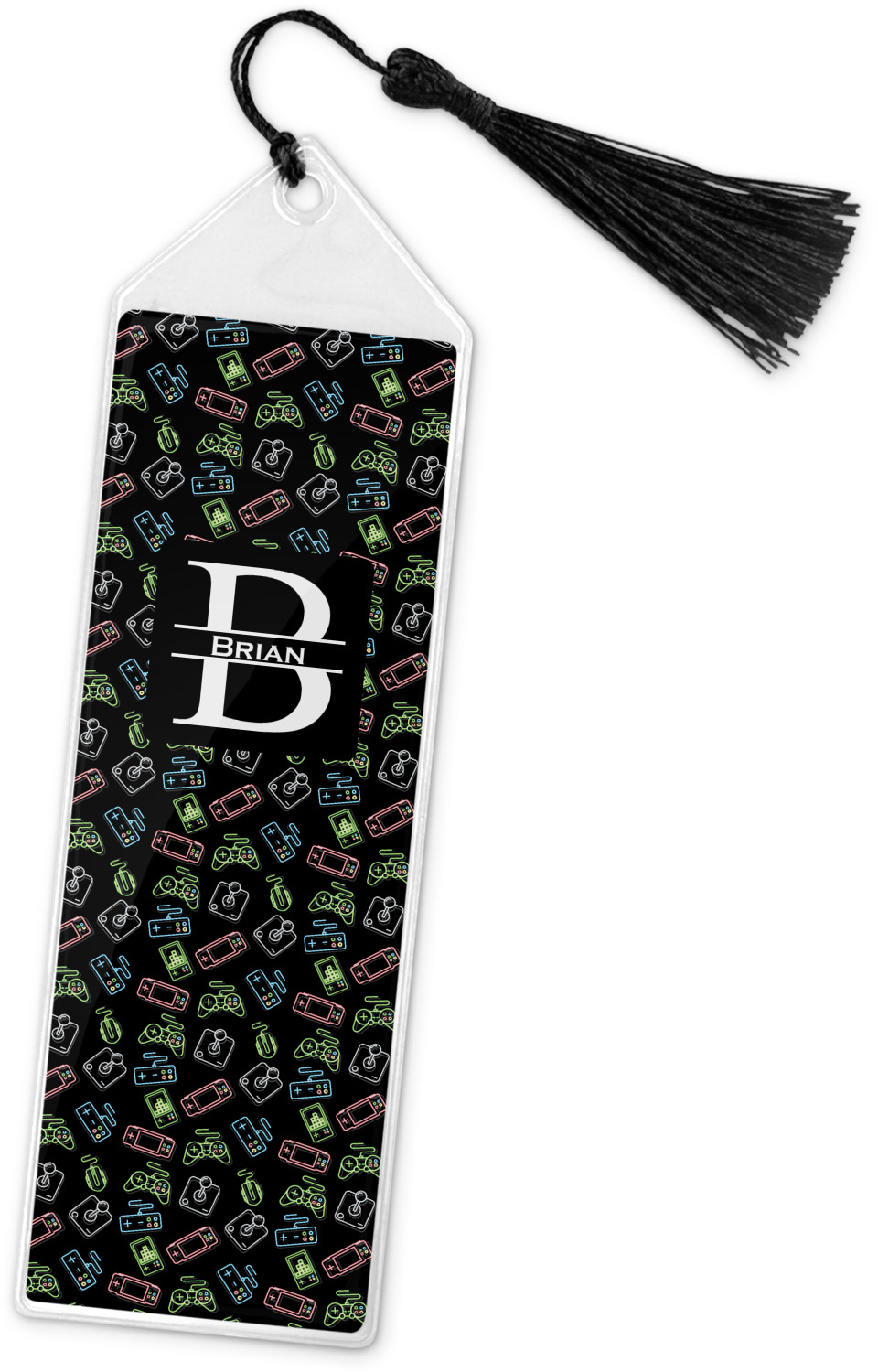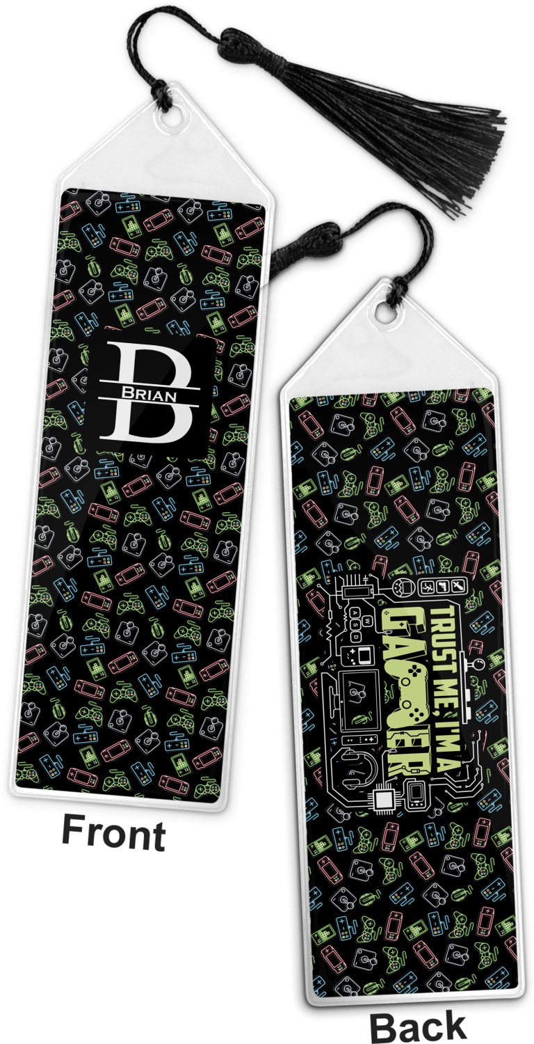 Your personalized bookmark is made of a sturdy, clear vinyl, and is approximately 7.5" x 2.25". We display your personalization on vinyl inserts that are placed on both sides. Accompanying each book marker is a black, fringe tassel that attaches to the reinforced, triangular header.