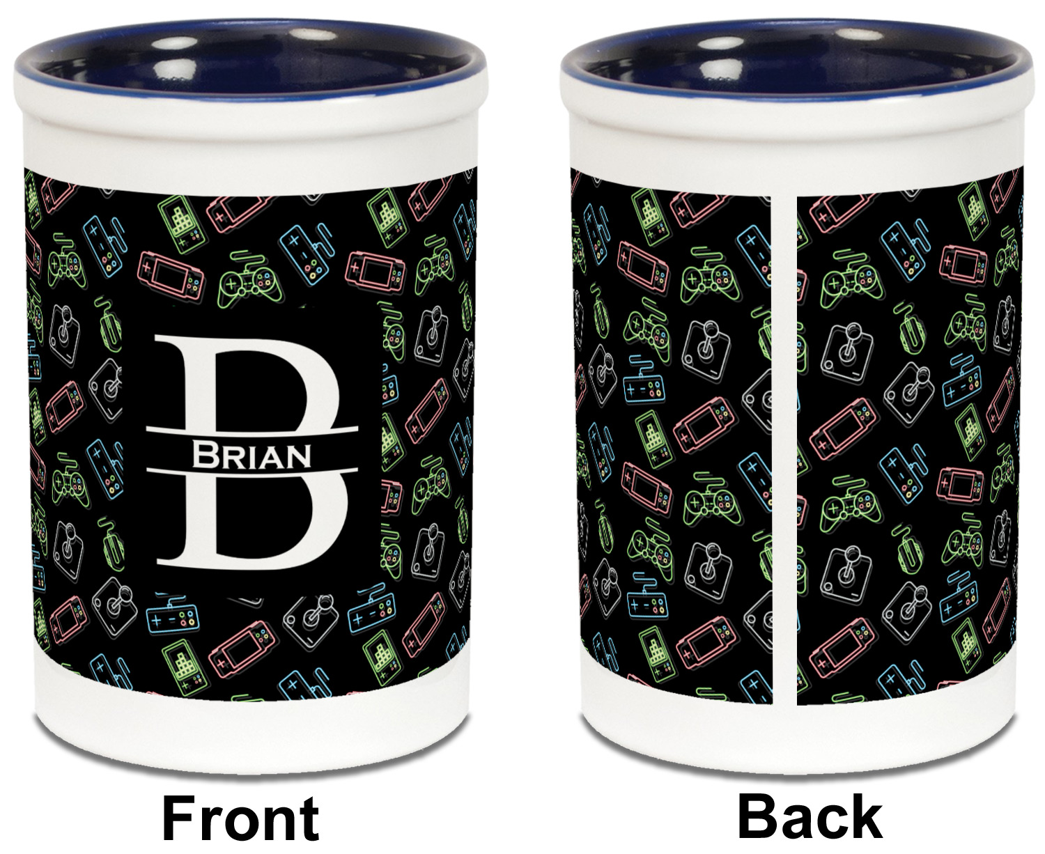 Both the blue and black pencil holders are a ceramic material, giving you a sturdy and long-lasting pen and pencil holder. We print your designs on the exterior of the pencil cup, covering most of the outside surface. There is a small white border on the top and bottom of the exterior of the pen holder, setting apart your design from the interior's color. Our ceramic pen caddy is roughly 3.5" x 3.5" x 5" in dimensions.