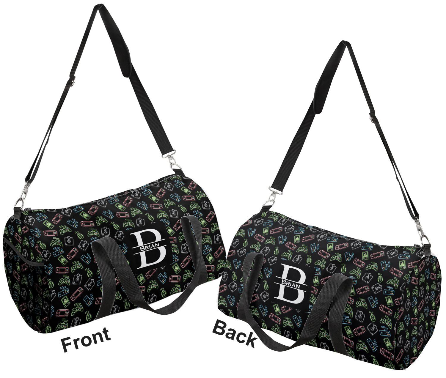 This duffle is a sturdy bag made of a canvas material. It comes in two sizes: Small (19"W x 9.5"H x 9.5"D) and Large (23"W x 12"H x 12"D). The bag is a cylindrical shape with a black adjustable strap and two handles. On one side is an elastic pouch to put a waterbottle or other small item. Your product will be sublimated with your design and is able to be designed on the front, back, and sides. Be sure to remember that the straps may cut into parts of your design if you upload your own artwork.
