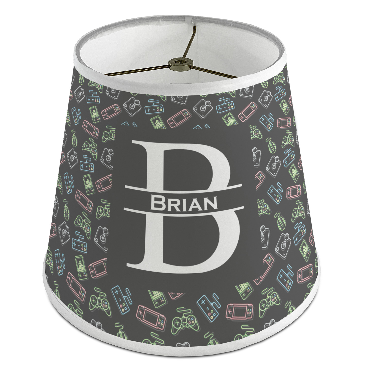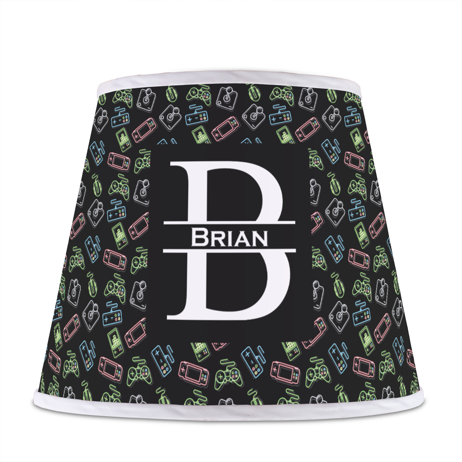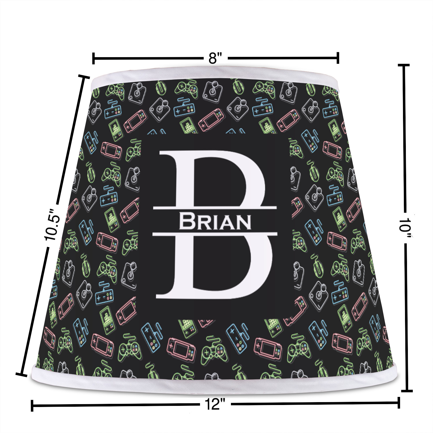 The base of this lampshade is 12 inches in diameter, and the top spans 8 inches in diameter. The total height of the lampshade is 10 inches. The angled nature of this custom lampshade concentrates the light, making it ideal for smaller spaces. This lampshade is made of matte, polyfilm, and displays your customization in its middle. The top and bottom of this colorful lamp shade are lined with a white fabric ribbon (which can be replaced with black inside the design studio) which frames your design and creates a sophisticated finish. As an UNO fitter lampshade, this unique lamp shade will fit a variety of bases.