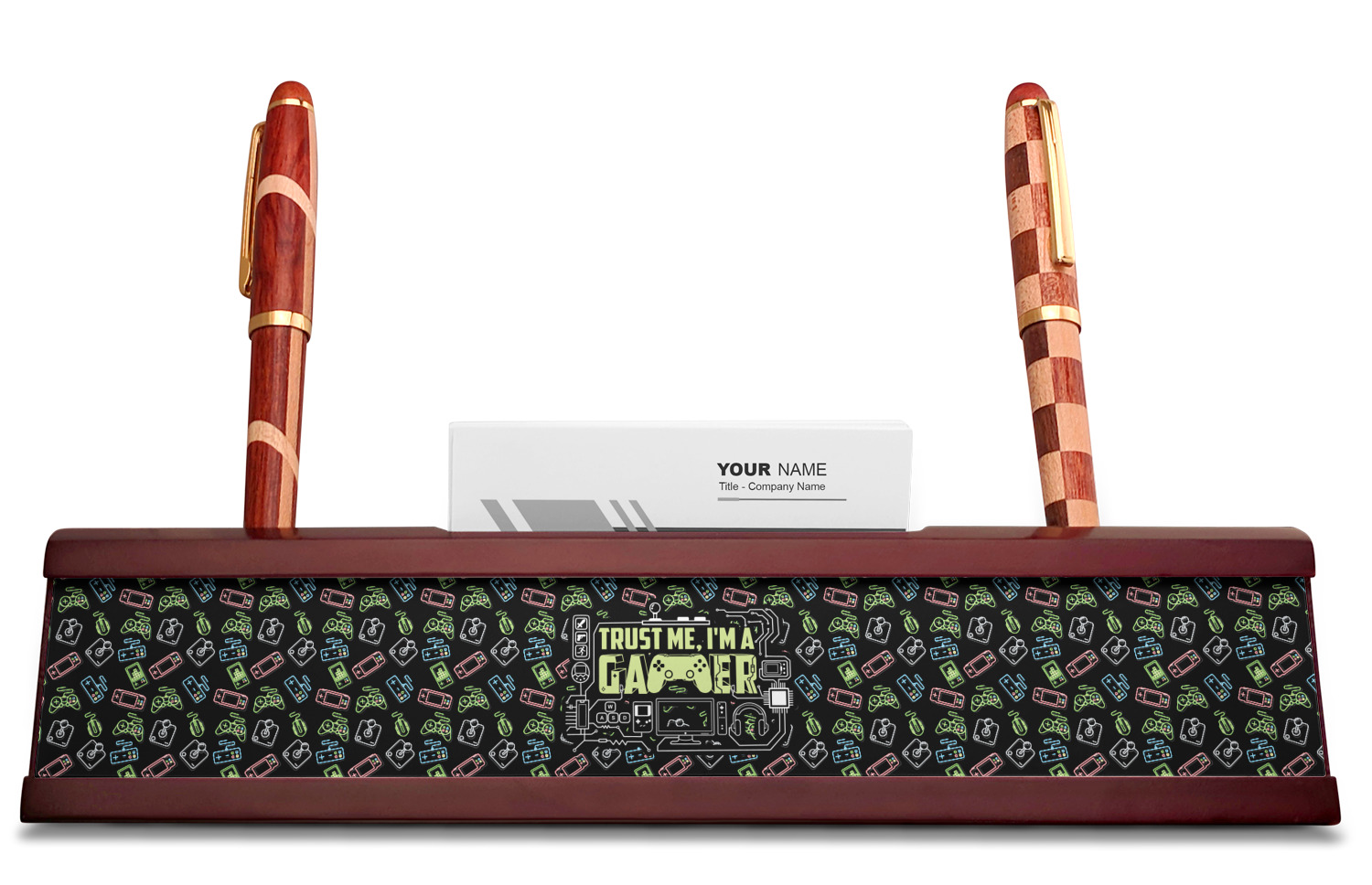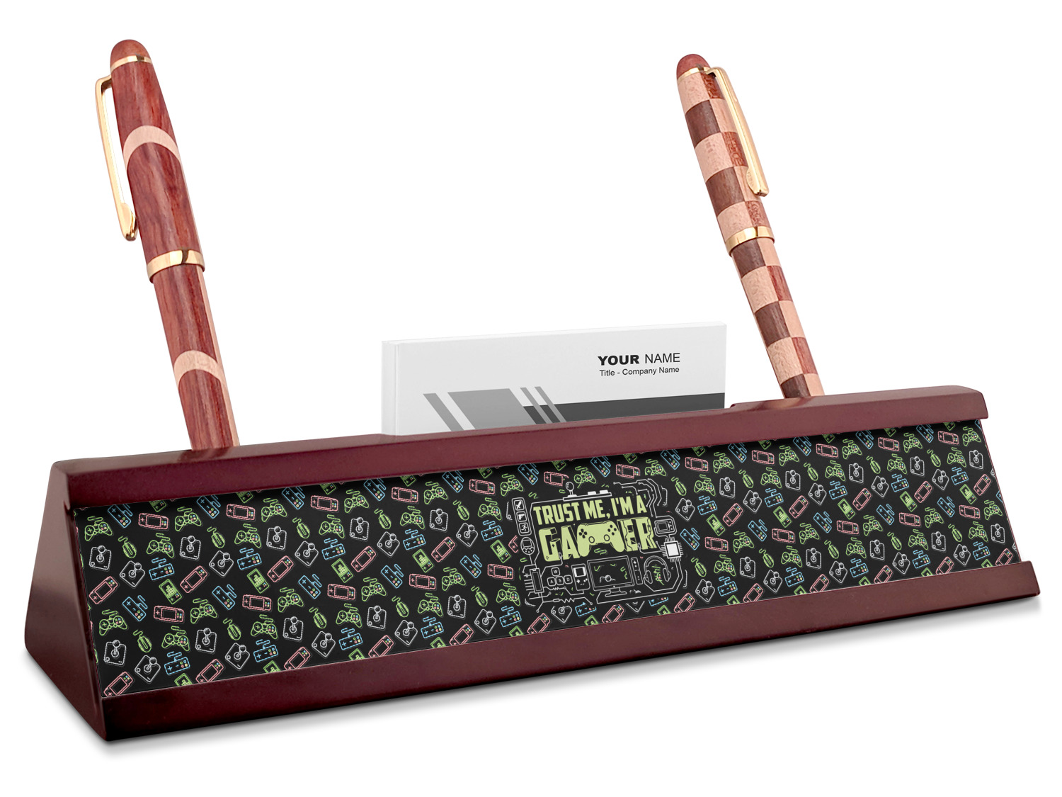 Your desk name plates are crafted from a high-quality, dark-cherry mahogany. At approximately 9.5 by 1.875 by 2.5 inches, this name plaque will fit perfectly, front and center, on your desk. Your customization spans across the entire face of the nameplate. Behind the nameplate lies a skinny slot that can fit approximately 15, traditionally-sized, business cards. You can also store your writing utensils on either side of this custom desk name plate.