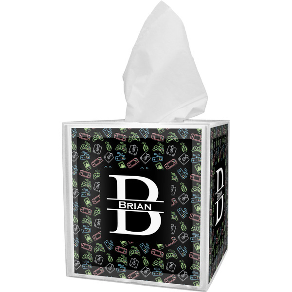 These tissue holders are built from durable acrylic and display your unique personalization on fine-quality vinyl inserts placed within the four sides and top. The box features two pieces, allowing you to easily switch out tissue boxes. On the sides, youll find ridges that ensure the top and base fit securely in place. The bottom of these tissue box holders has four, rubber, non-slip pads to prevent the box from scuffing any surface you decide to display it on. Each box can fit a standard 5 by 5-inch box of tissues.