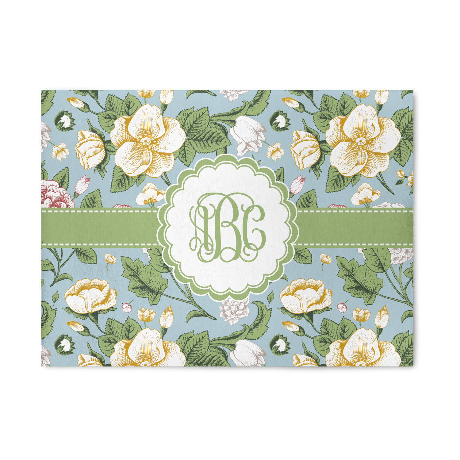 The vintage flowers in this design are cream colored magnolias, surrounded by olive green leaves on a demure blue background. The design has a classic ribbon in olive green trimmed in white. The decorative scalloped label is in white and is the perfect place for your monogram for that personal touch to pull the entire design together.