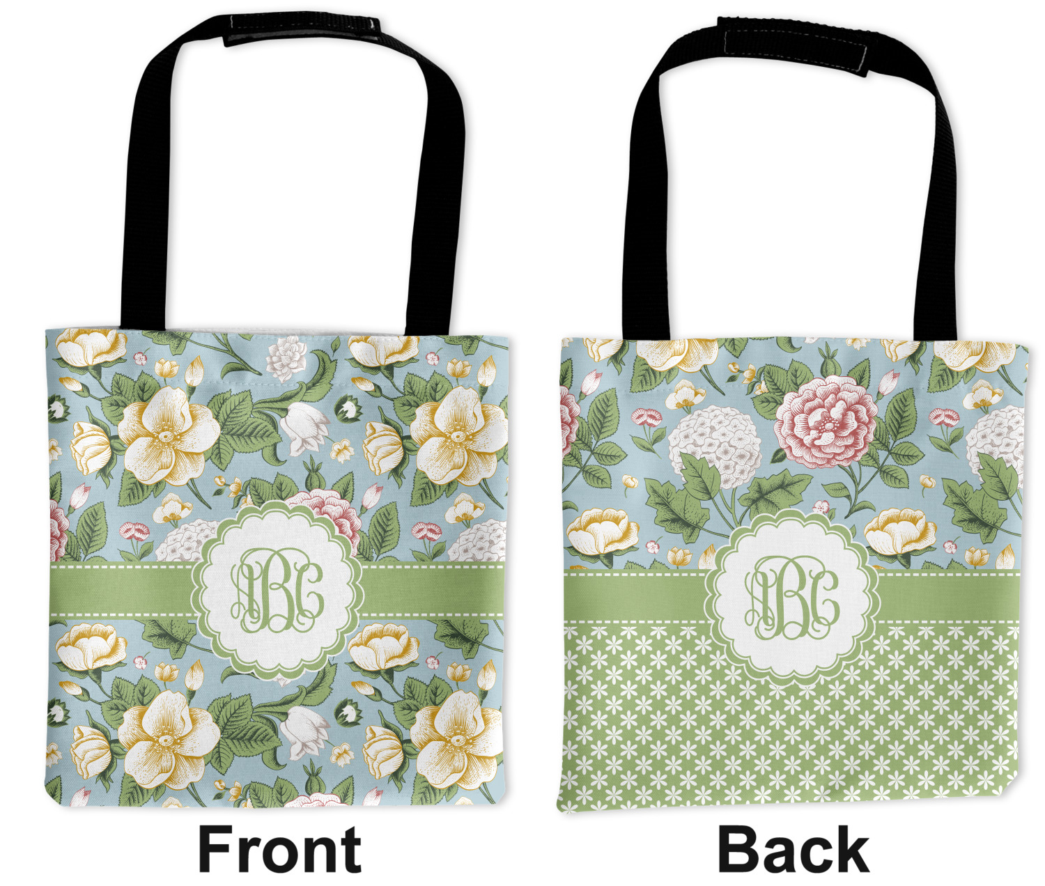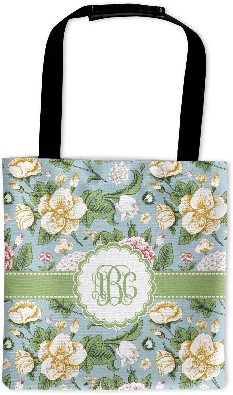 The vintage flowers in this design are cream colored magnolias, surrounded by olive green leaves on a demure blue background. The design has a classic ribbon in olive green trimmed in white. The decorative scalloped label is in white and is the perfect place for your monogram for that personal touch to pull the entire design together.