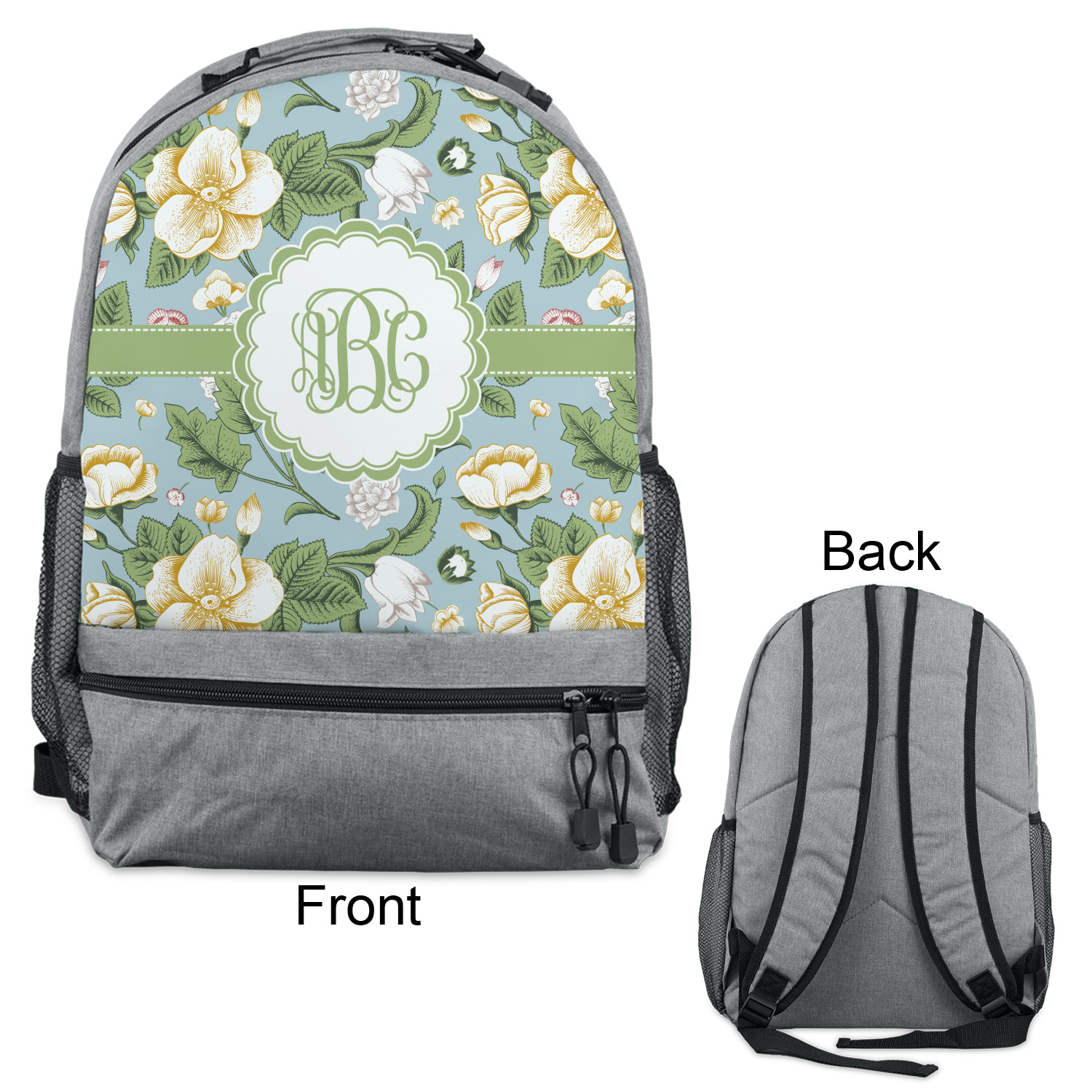 The vintage flowers in this design are cream colored magnolias, surrounded by olive green leaves on a demure blue background. The design has a classic ribbon in olive green trimmed in white. The decorative scalloped label is in white and is the perfect place for your monogram for that personal touch to pull the entire design together.