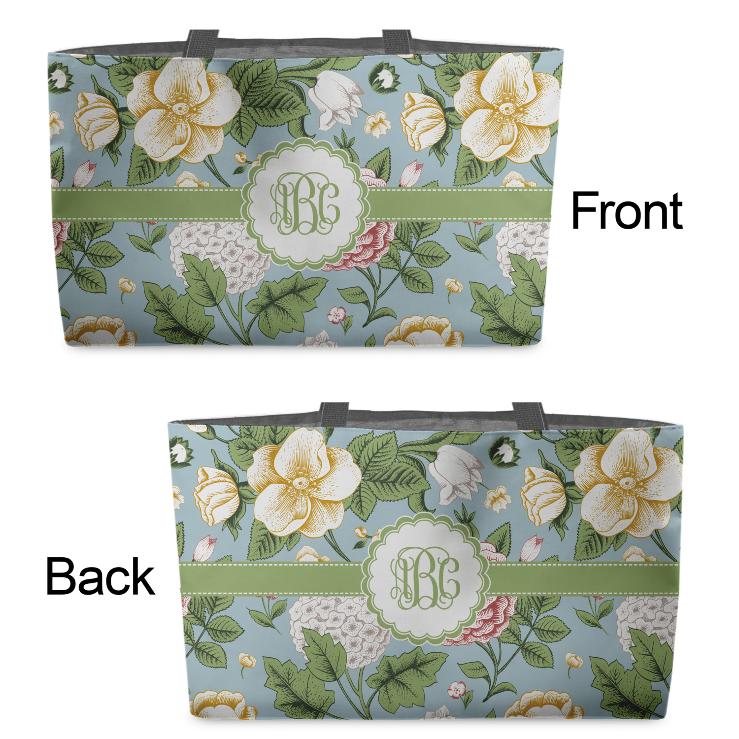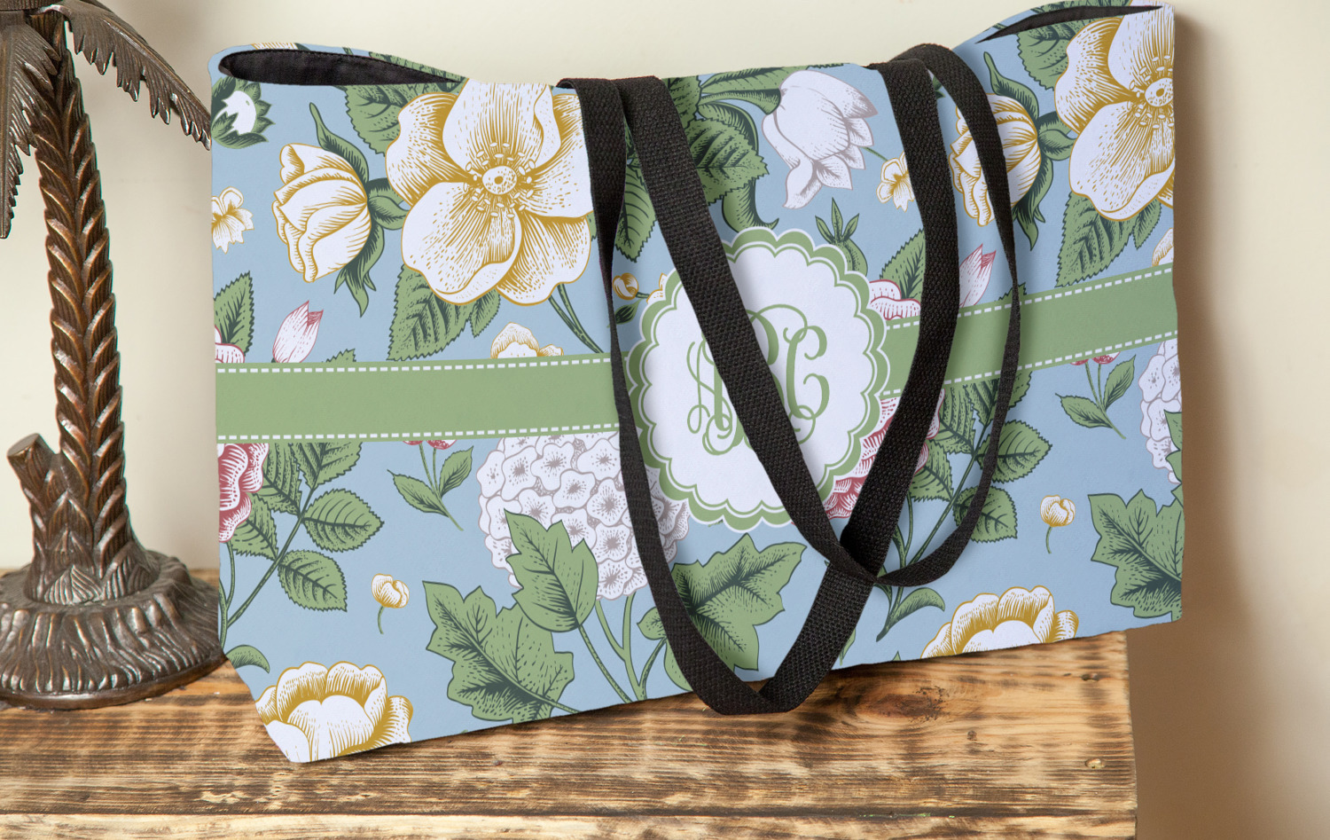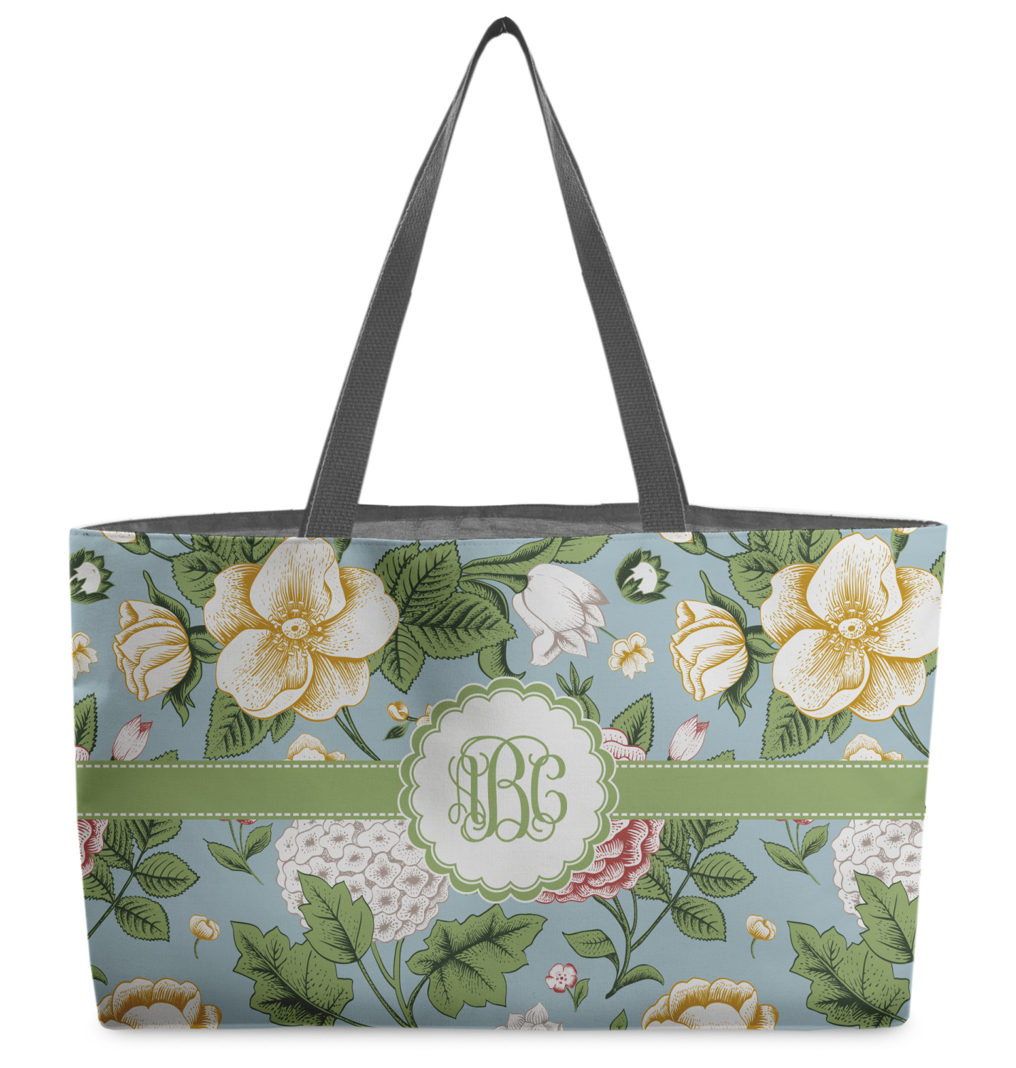 These beach totes are handmade here in the USA. Fabric is printed with your design. The tote is then sewn from the fabric pieces, lining and handles added.