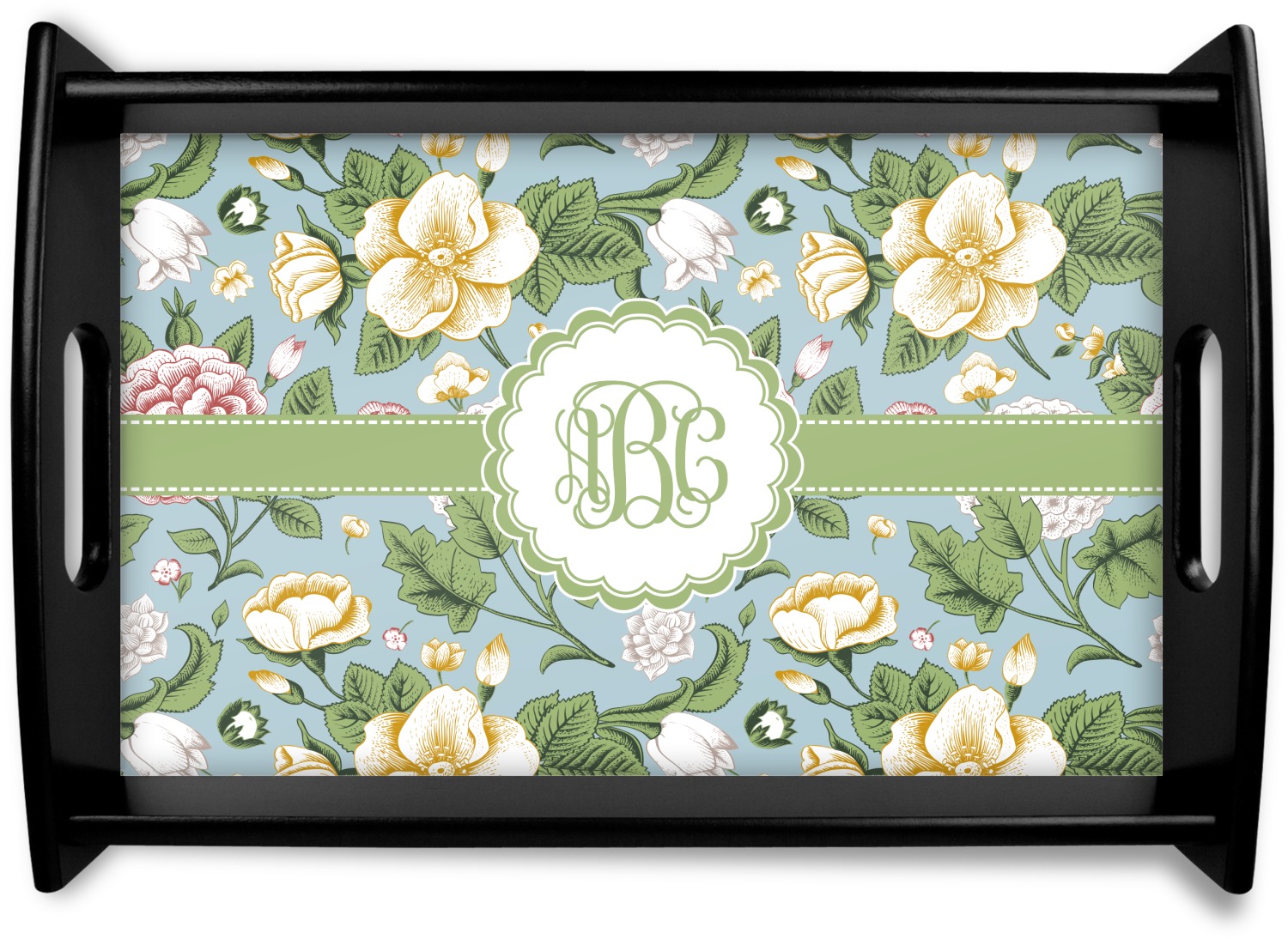 This serving tray with handles features square edges and two rounded sides, creating a very modern look. Each side is fabricated from a beautifully cut, natural wood. The bottom of the interior of the tray displays your customized design in bright, vibrant color. The tray is sold in both a black color and a natural wood look. Each variation of the wood serving tray has two sizes: Small, which is 14" x 10" x 2.25", and Large, which is 19.5" x 13.5" x 2.75".