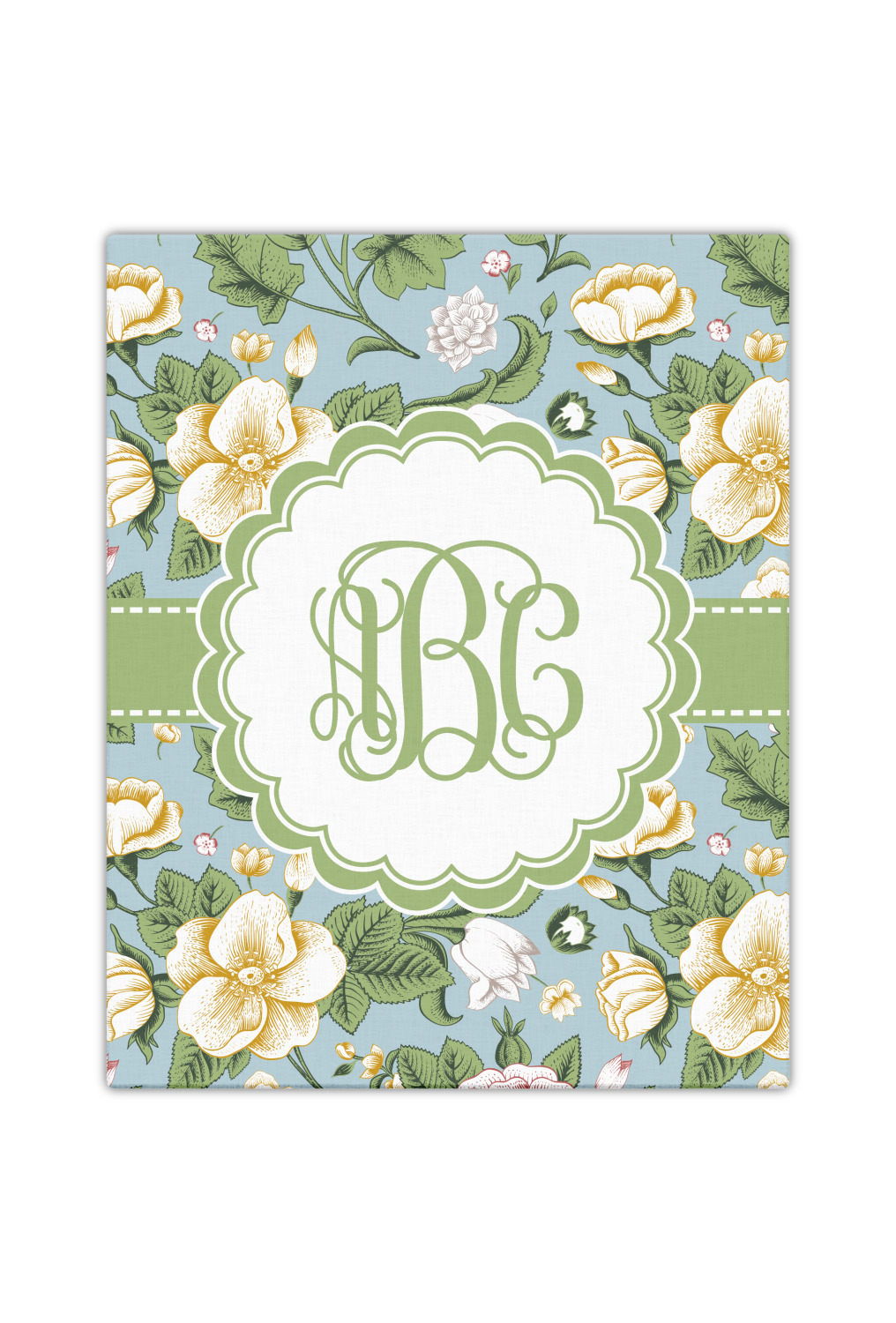 The vintage flowers in this design are cream colored magnolias, surrounded by olive green leaves on a demure blue background. The design has a classic ribbon in olive green trimmed in white. The decorative scalloped label is in white and is the perfect place for your monogram for that personal touch to pull the entire design together.