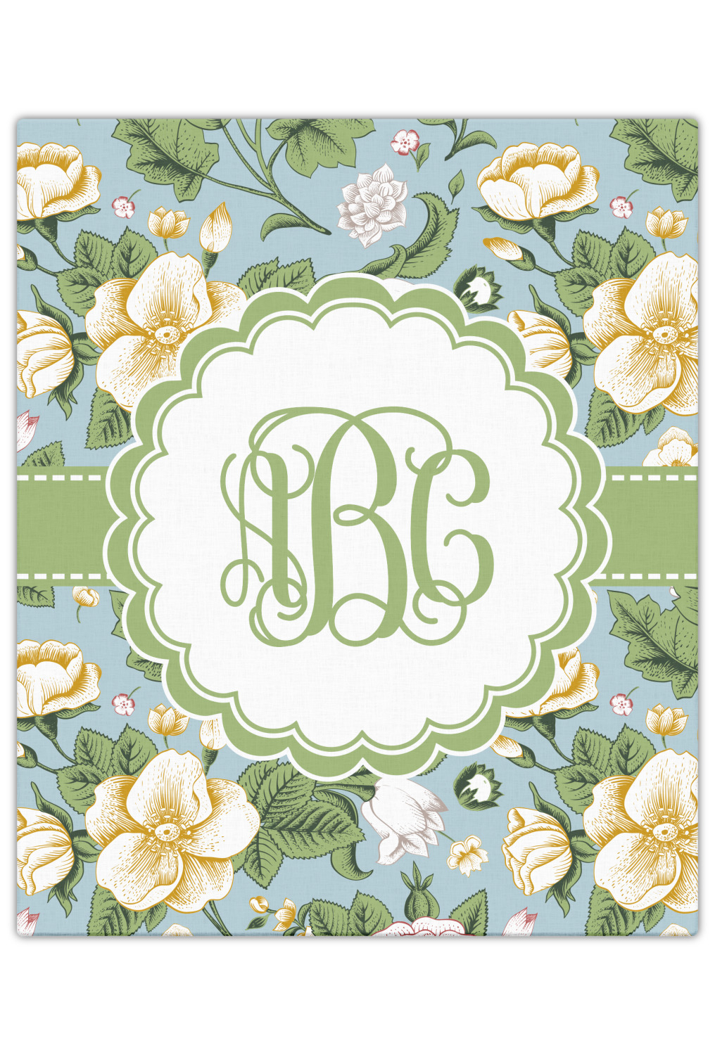 The vintage flowers in this design are cream colored magnolias, surrounded by olive green leaves on a demure blue background. The design has a classic ribbon in olive green trimmed in white. The decorative scalloped label is in white and is the perfect place for your monogram for that personal touch to pull the entire design together.