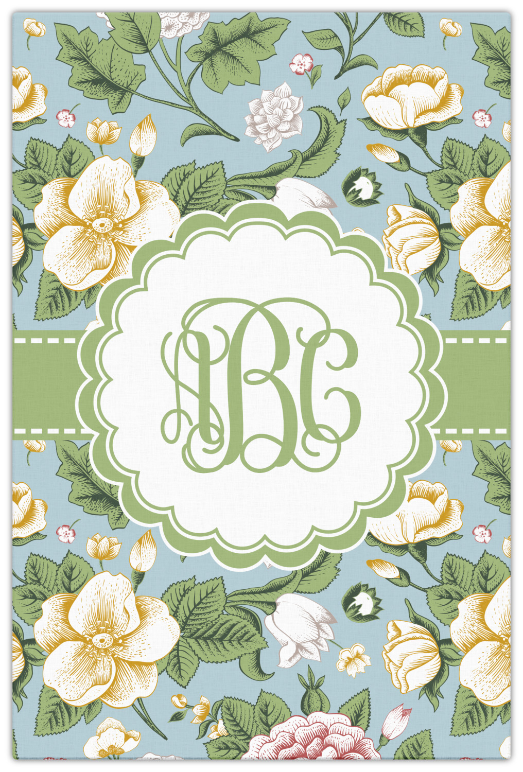 The vintage flowers in this design are cream colored magnolias, surrounded by olive green leaves on a demure blue background. The design has a classic ribbon in olive green trimmed in white. The decorative scalloped label is in white and is the perfect place for your monogram for that personal touch to pull the entire design together.