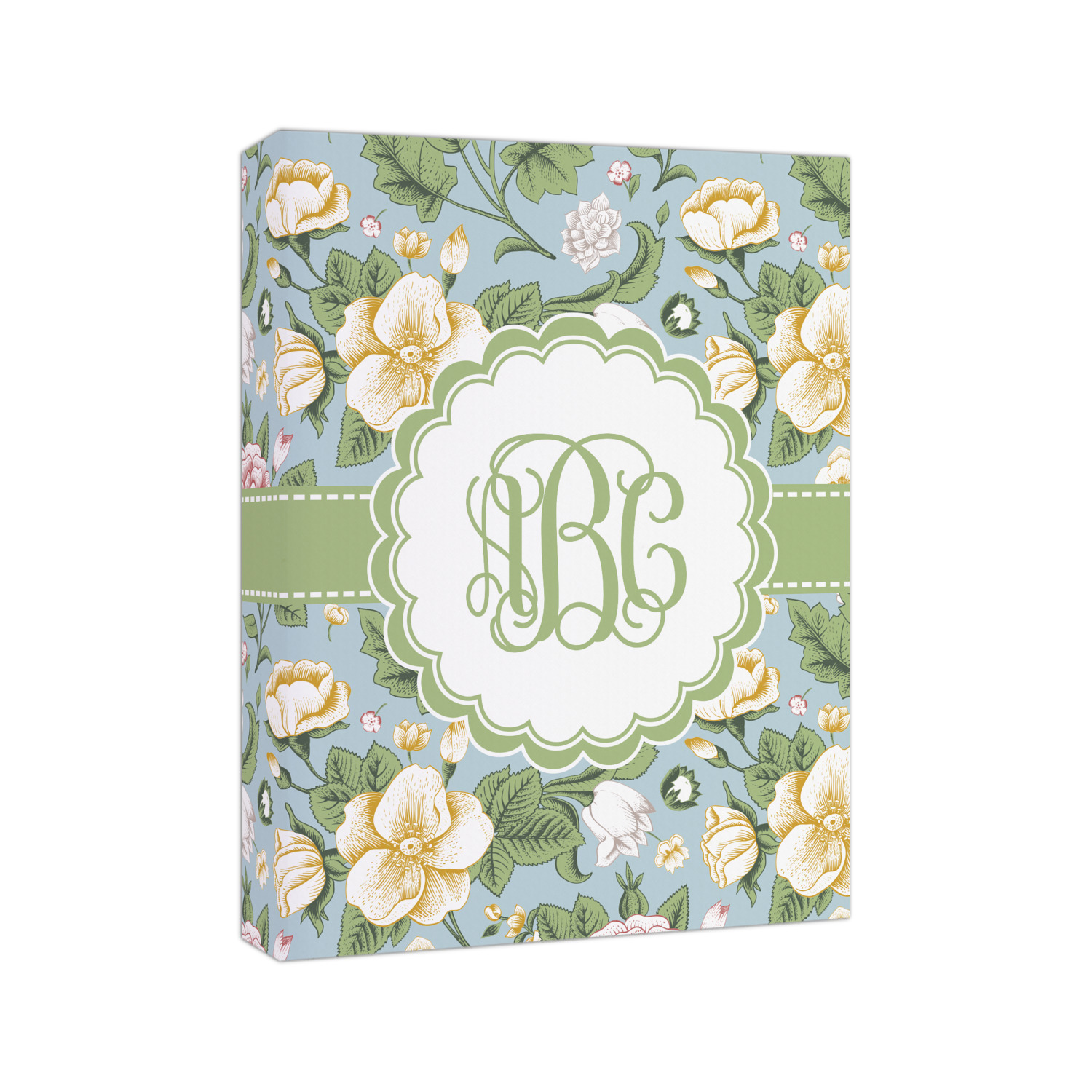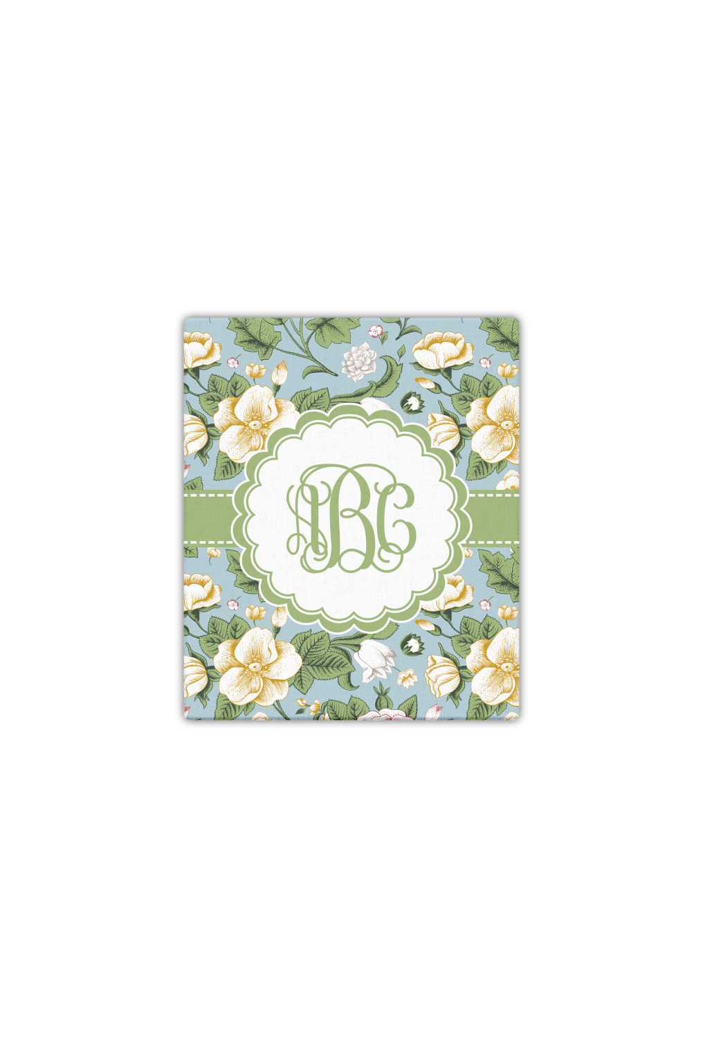 The vintage flowers in this design are cream colored magnolias, surrounded by olive green leaves on a demure blue background. The design has a classic ribbon in olive green trimmed in white. The decorative scalloped label is in white and is the perfect place for your monogram for that personal touch to pull the entire design together.