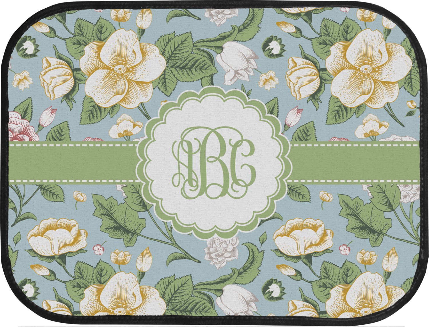 The vintage flowers in this design are cream colored magnolias, surrounded by olive green leaves on a demure blue background. The design has a classic ribbon in olive green trimmed in white. The decorative scalloped label is in white and is the perfect place for your monogram for that personal touch to pull the entire design together.