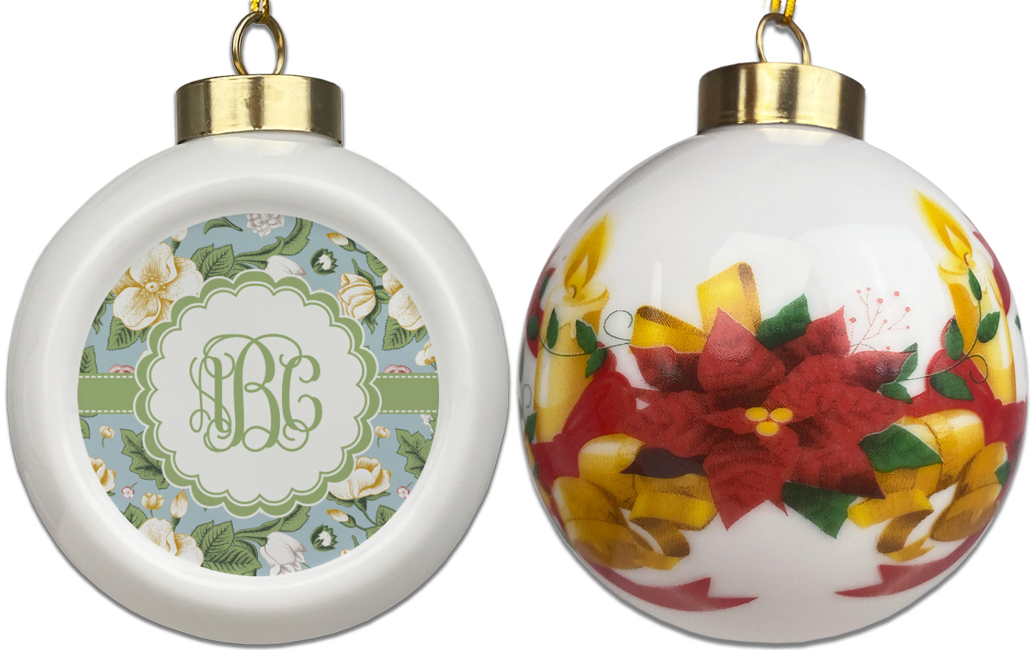 Our Christmas ornaments are a unique ceramic ball shape with a twist as it has a flat face to display your custom design! Select from one of our two design types - Christmas Tree or Poinsettia Garland - to adorn the curved back of your personal design. Each ornament measures 3H x 2.5W x 2D accompanied with a gold string accent for finishing touches to hang on your beautiful Christmas tree!