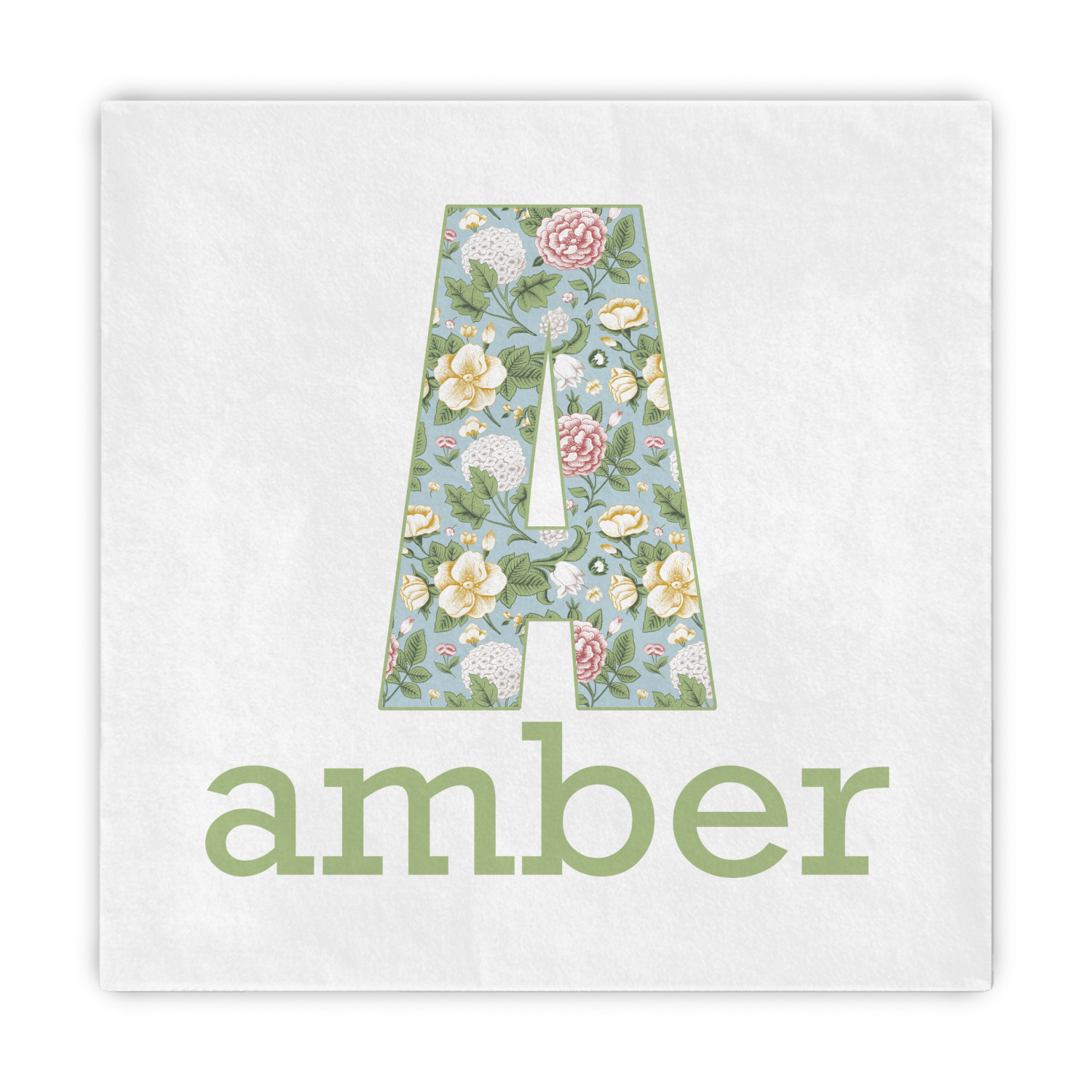 The vintage flowers in this design are cream colored magnolias, surrounded by olive green leaves on a demure blue background. The design has a classic ribbon in olive green trimmed in white. The decorative scalloped label is in white and is the perfect place for your monogram for that personal touch to pull the entire design together.