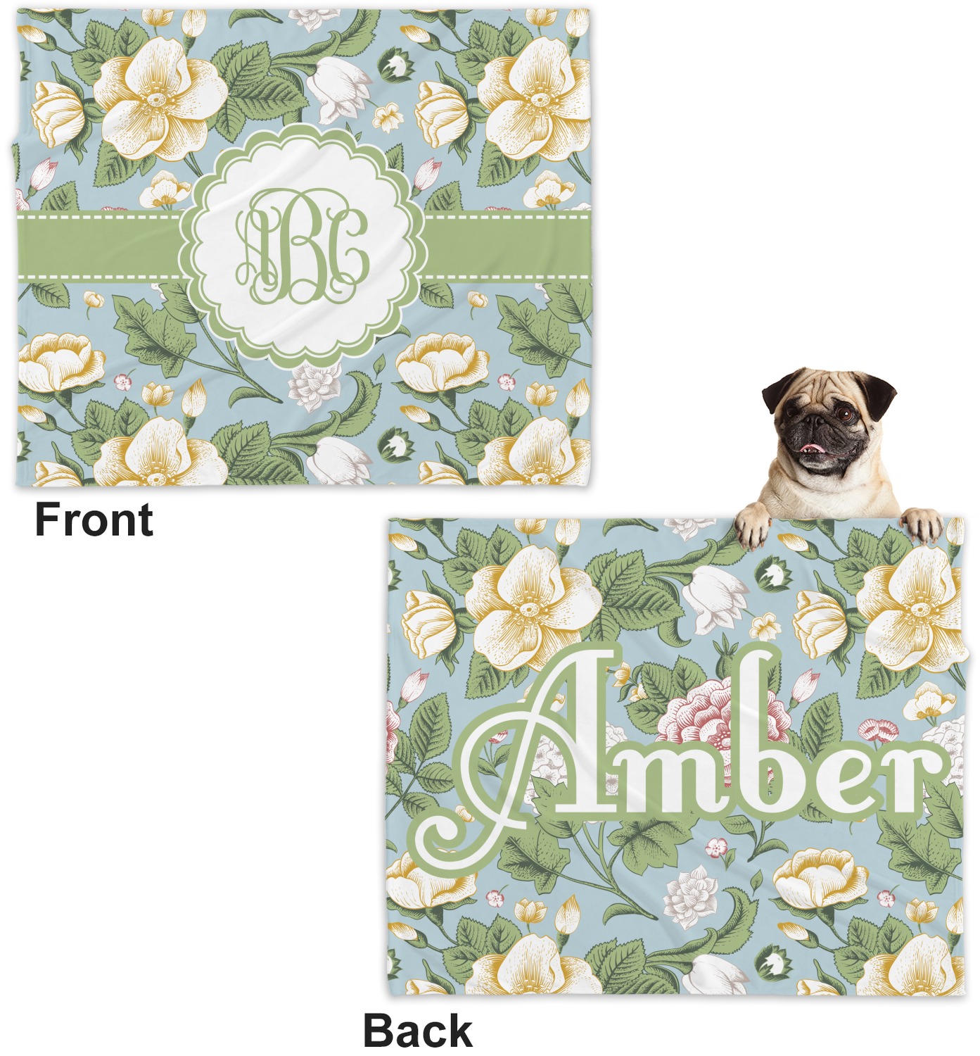 These dog blankets are crafted from a gentle, soft-to-the-touch, minky material. We print your customizations, either matching or differing, on both the top and underside of the blanket. These personalized dog blankets are available in two sizes: regular and large. Our regular size, at 40" x 30", accommodates small and some medium size dogs. At 60" x 50", our large dog blanket is a better fit for bigger breeds. Though specialized for dogs, these blankets still make a thoughtful gift for your favorite feline, or any other pet in mind!