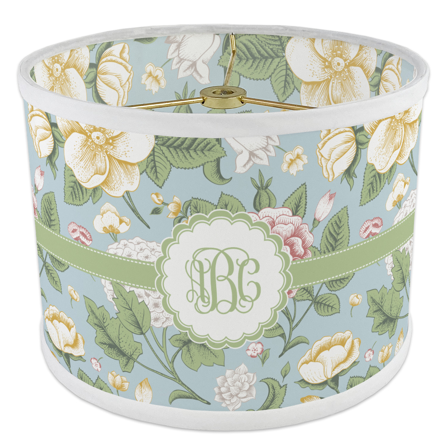 The vintage flowers in this design are cream colored magnolias, surrounded by olive green leaves on a demure blue background. The design has a classic ribbon in olive green trimmed in white. The decorative scalloped label is in white and is the perfect place for your monogram for that personal touch to pull the entire design together.