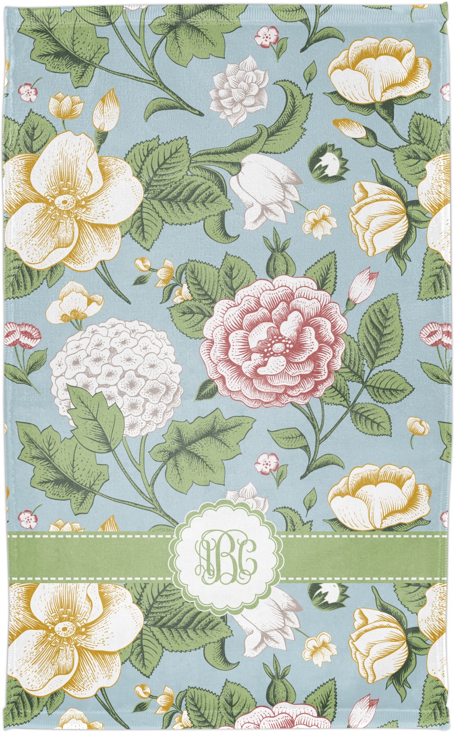 The vintage flowers in this design are cream colored magnolias, surrounded by olive green leaves on a demure blue background. The design has a classic ribbon in olive green trimmed in white. The decorative scalloped label is in white and is the perfect place for your monogram for that personal touch to pull the entire design together.
