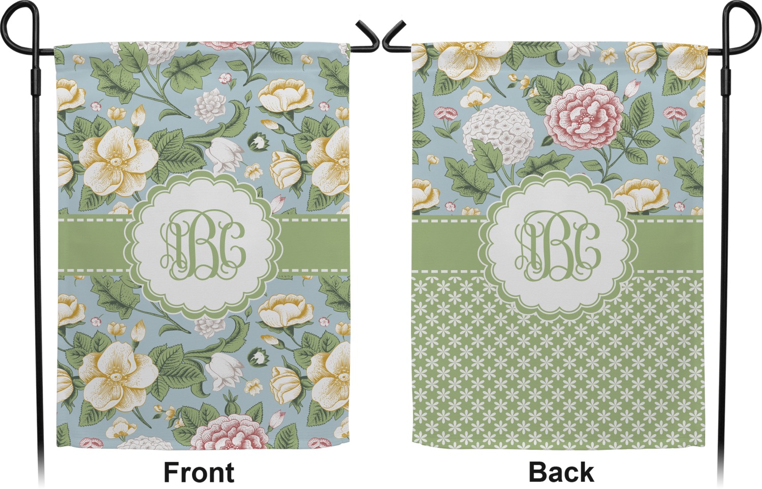 These custom garden flags are made of a durable, double-ply, polyester weave, allowing them to withstand the elements year round. The small flags measure at approximately 12 by 18 inches. The large flags measure out to 28 by 37 inches. You can order these decorative flags with your customization printed on the front only, or the front and back.