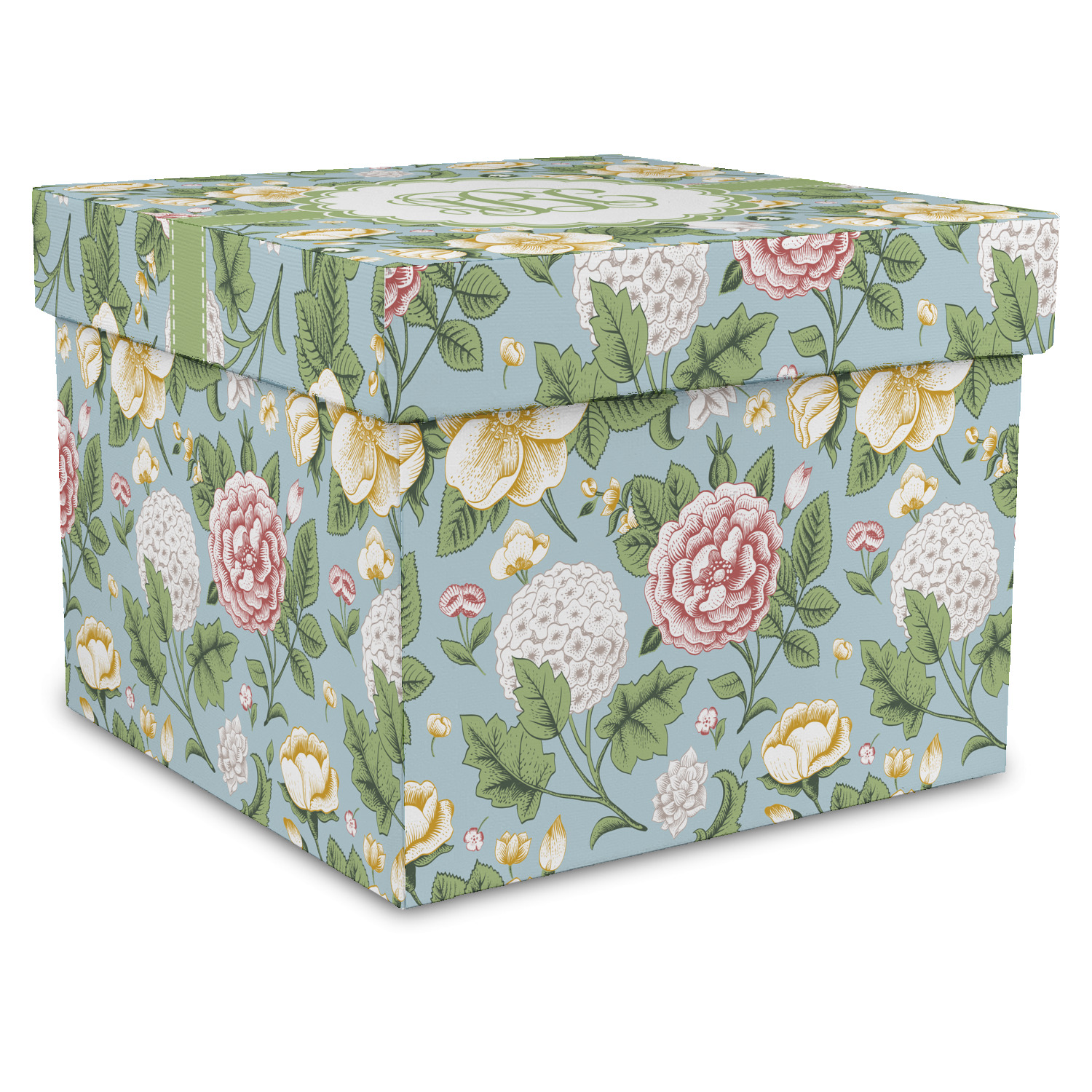 The vintage flowers in this design are cream colored magnolias, surrounded by olive green leaves on a demure blue background. The design has a classic ribbon in olive green trimmed in white. The decorative scalloped label is in white and is the perfect place for your monogram for that personal touch to pull the entire design together.