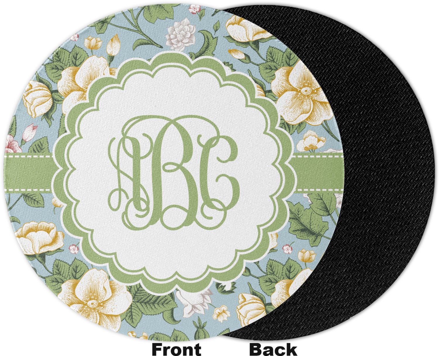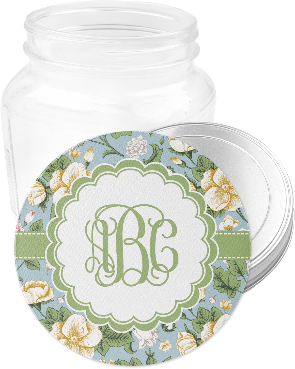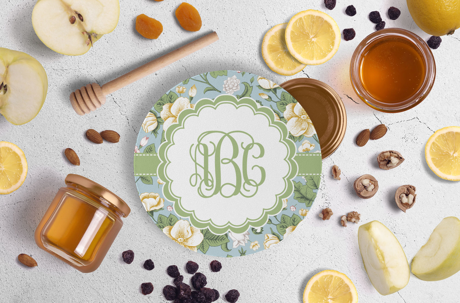 The vintage flowers in this design are cream colored magnolias, surrounded by olive green leaves on a demure blue background. The design has a classic ribbon in olive green trimmed in white. The decorative scalloped label is in white and is the perfect place for your monogram for that personal touch to pull the entire design together.
