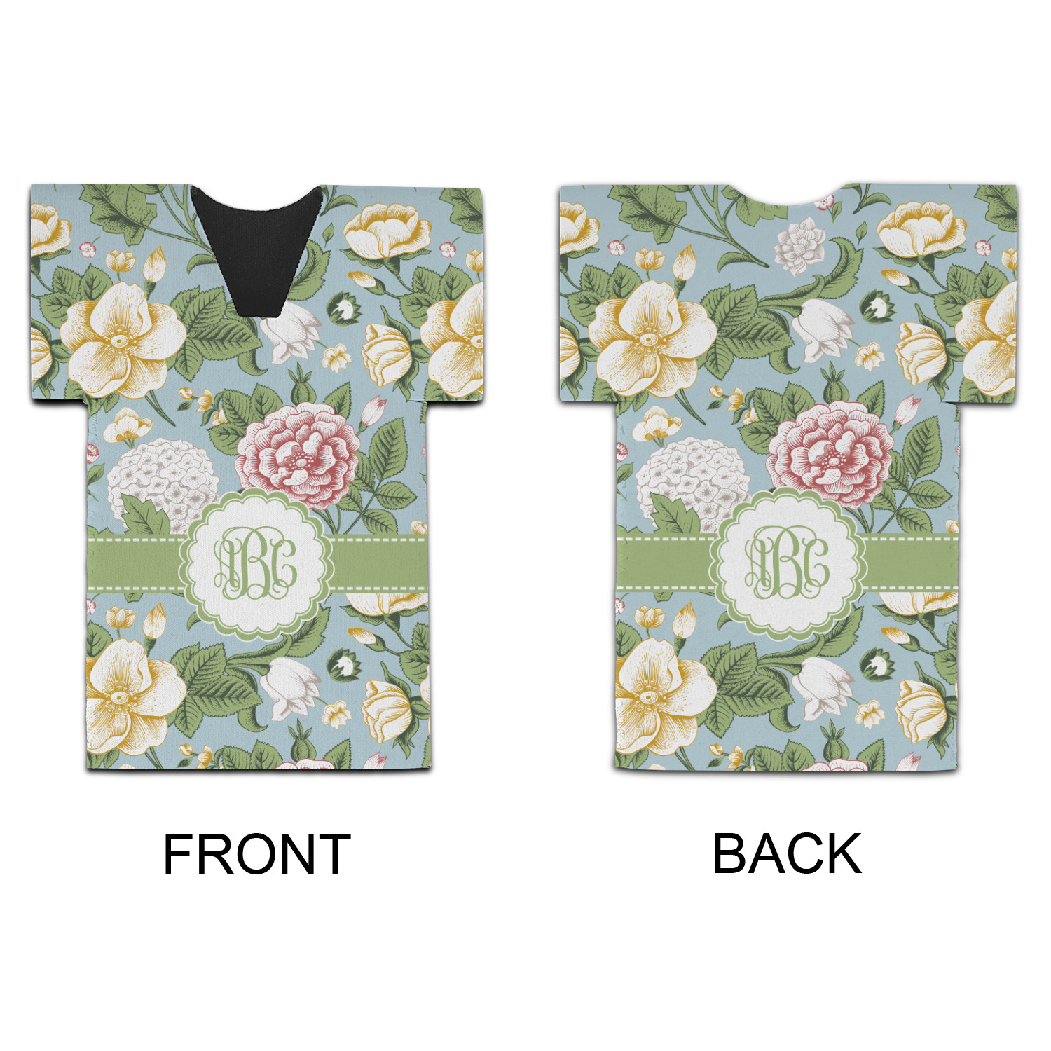The vintage flowers in this design are cream colored magnolias, surrounded by olive green leaves on a demure blue background. The design has a classic ribbon in olive green trimmed in white. The decorative scalloped label is in white and is the perfect place for your monogram for that personal touch to pull the entire design together.