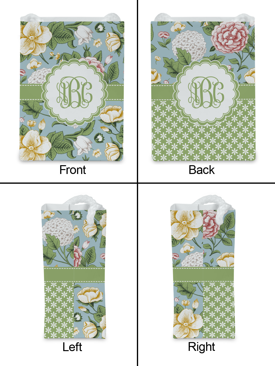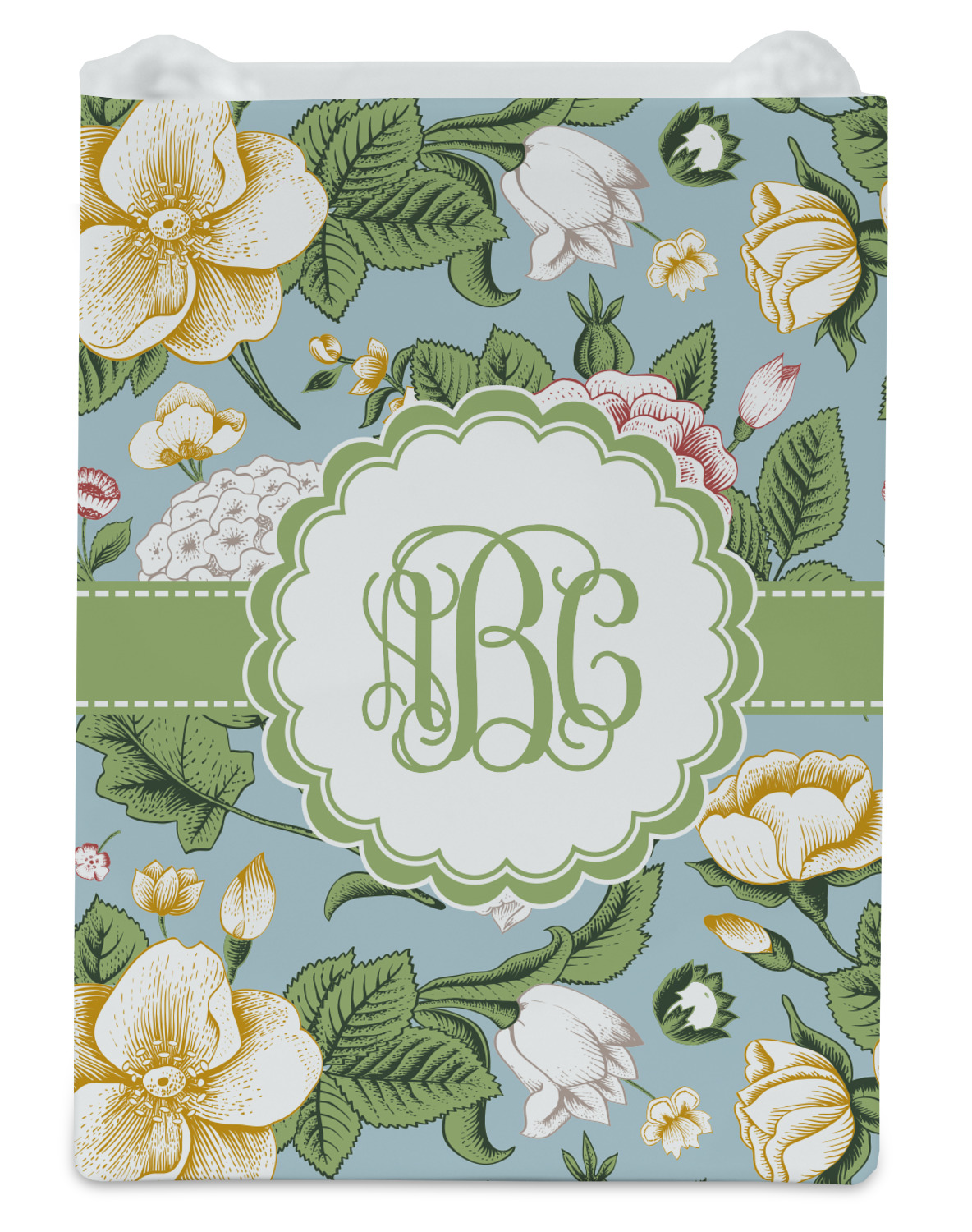 The vintage flowers in this design are cream colored magnolias, surrounded by olive green leaves on a demure blue background. The design has a classic ribbon in olive green trimmed in white. The decorative scalloped label is in white and is the perfect place for your monogram for that personal touch to pull the entire design together.