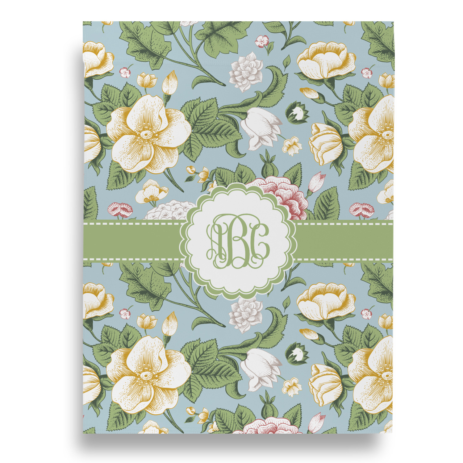 The vintage flowers in this design are cream colored magnolias, surrounded by olive green leaves on a demure blue background. The design has a classic ribbon in olive green trimmed in white. The decorative scalloped label is in white and is the perfect place for your monogram for that personal touch to pull the entire design together.