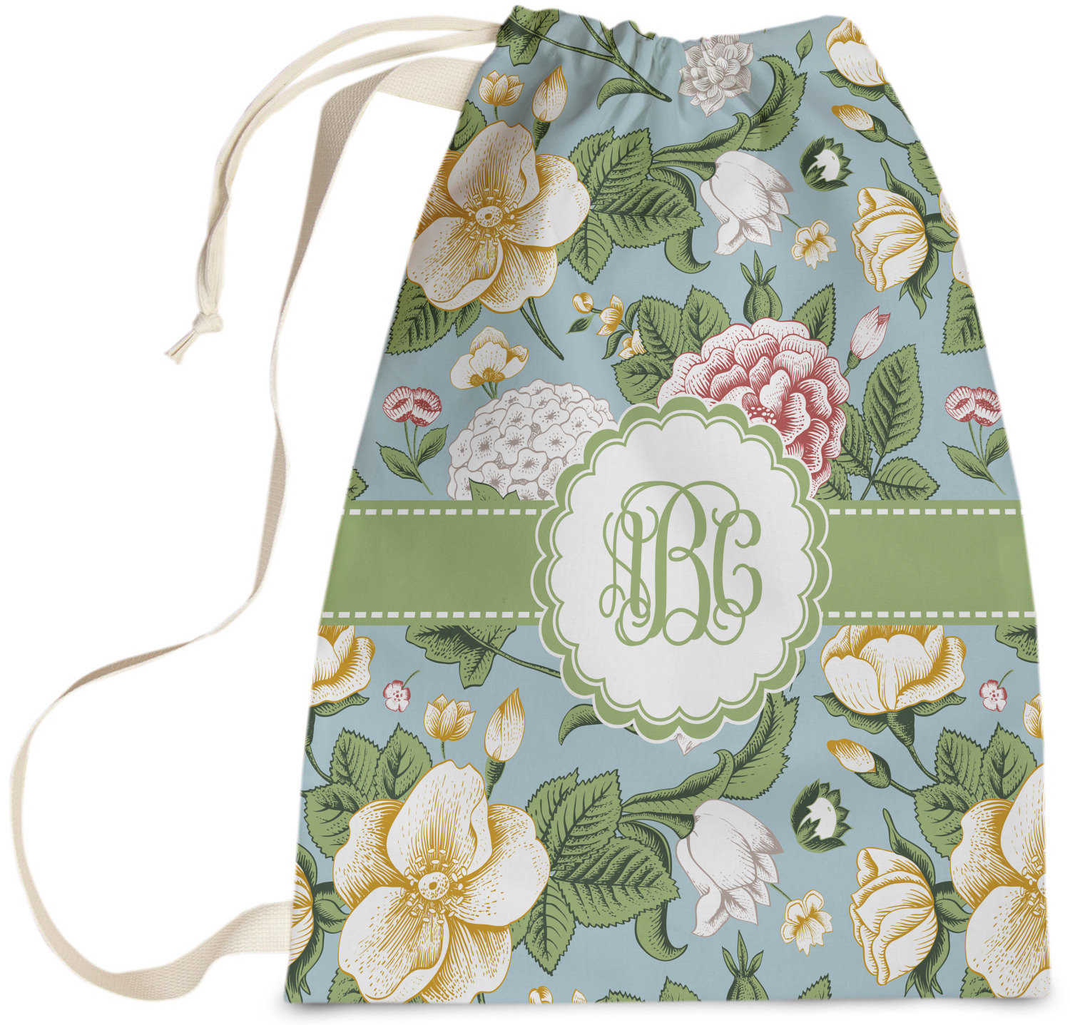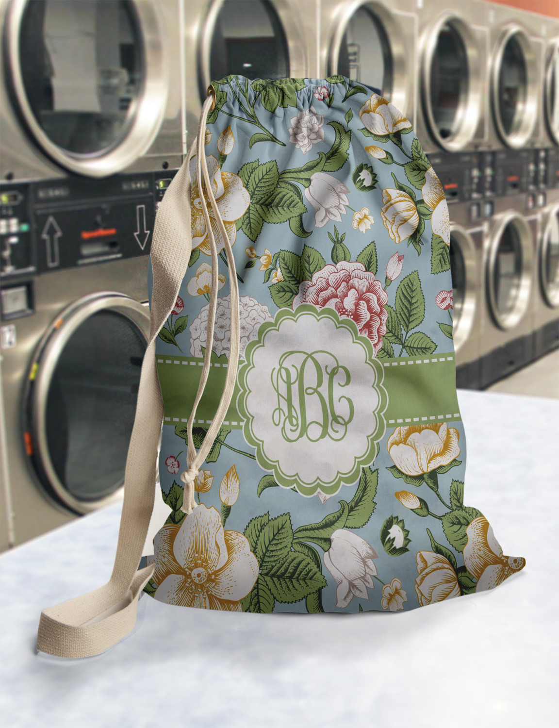 Carry your laundry in style with these customized laundry bags. Available in two sizes, featuring a natural colored woven strap and a cinch cord, these bags hold a lot of clothes or anything else you want to fit in them.