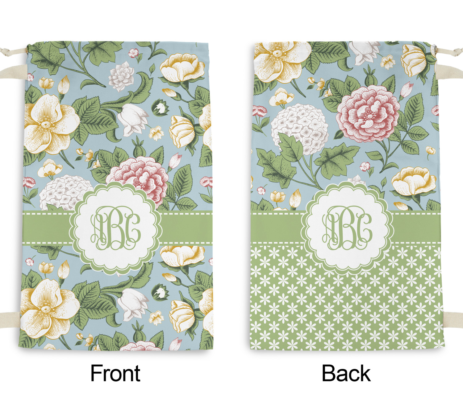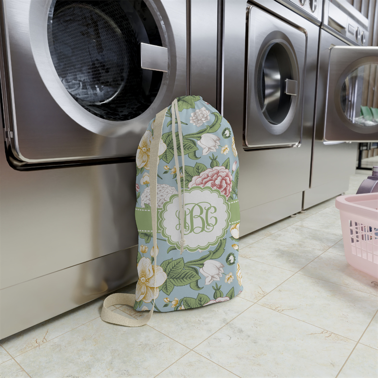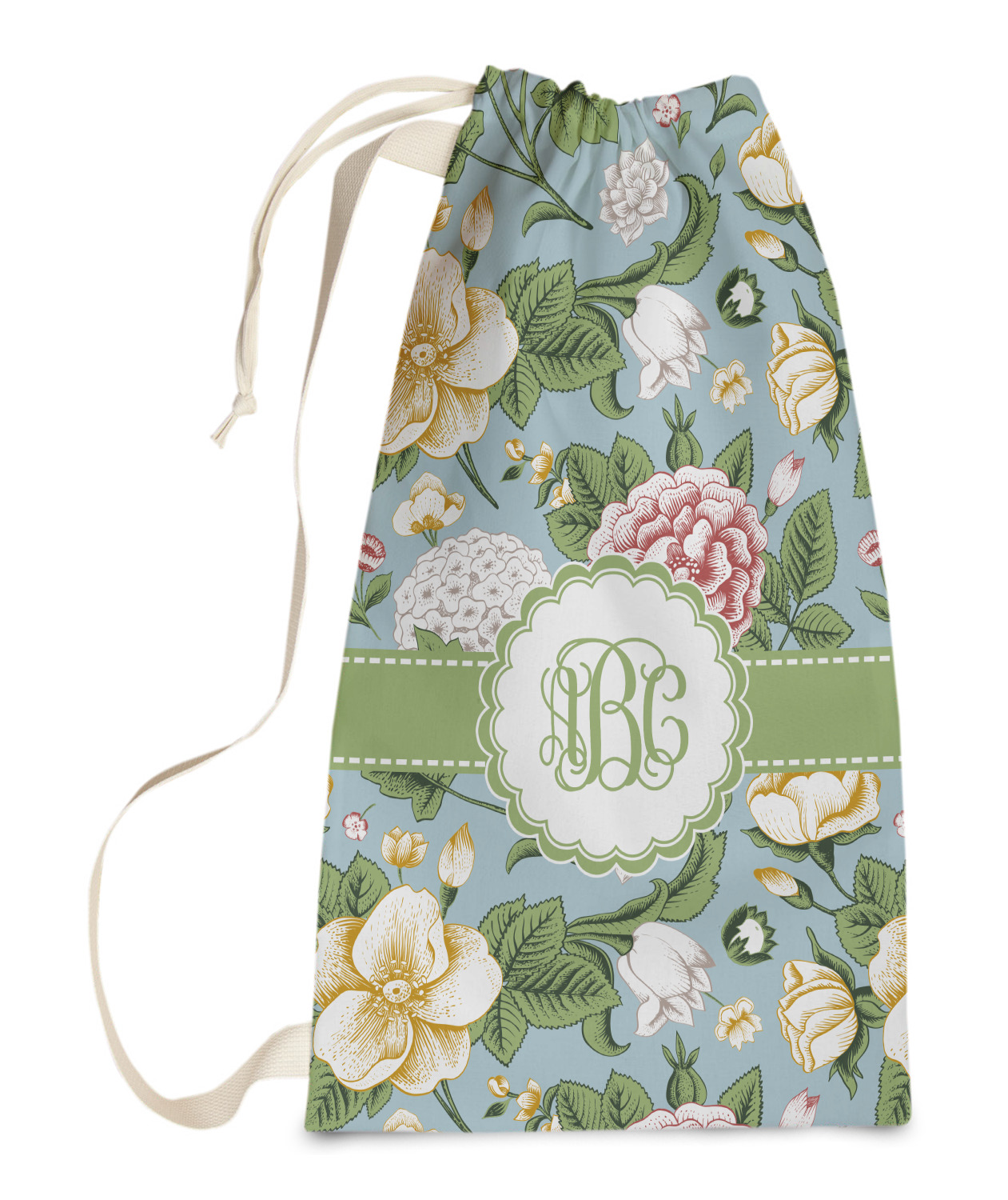 Carry your laundry in style with these customized laundry bags. Available in two sizes, featuring a natural colored woven strap and a cinch cord, these bags hold a lot of clothes or anything else you want to fit in them.