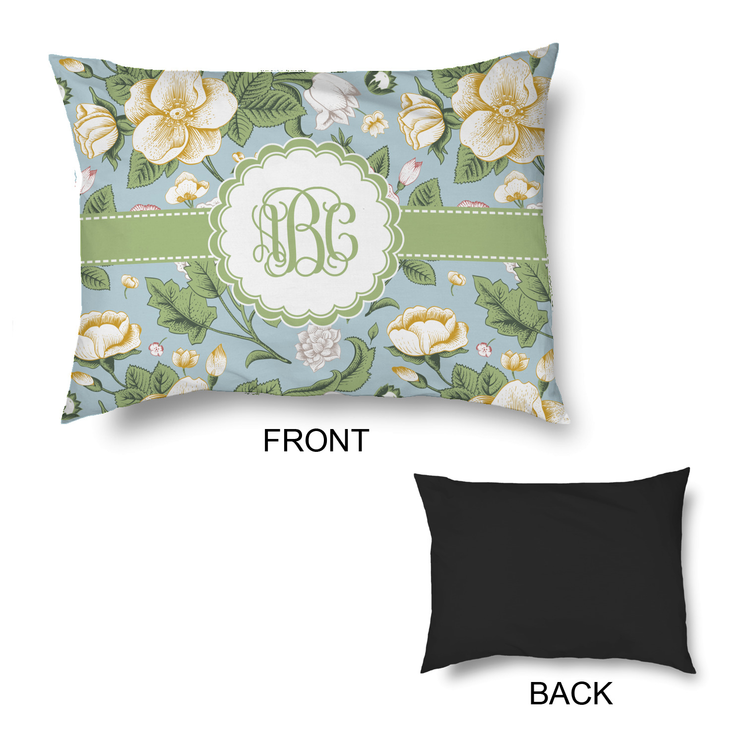 The vintage flowers in this design are cream colored magnolias, surrounded by olive green leaves on a demure blue background. The design has a classic ribbon in olive green trimmed in white. The decorative scalloped label is in white and is the perfect place for your monogram for that personal touch to pull the entire design together.