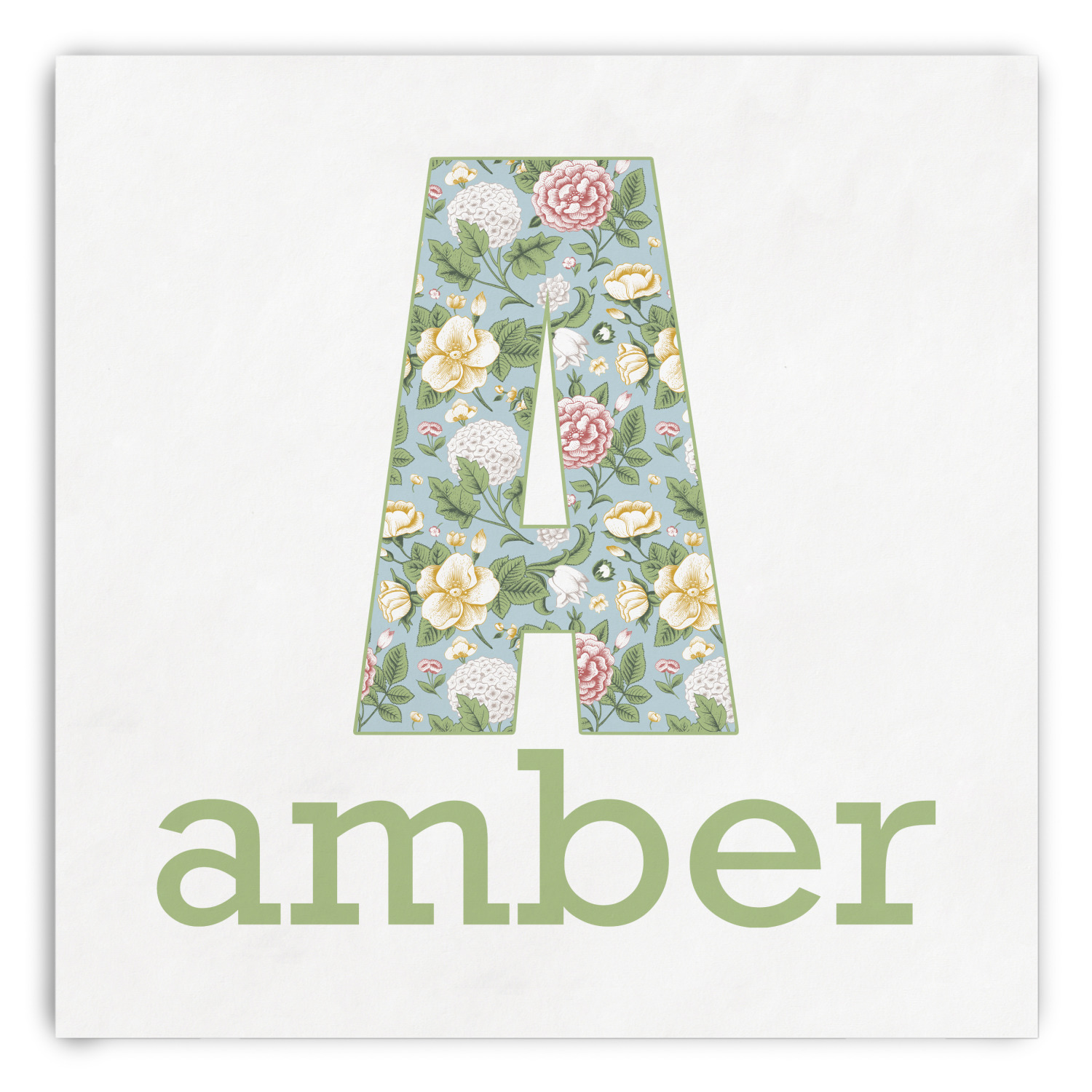 The vintage flowers in this design are cream colored magnolias, surrounded by olive green leaves on a demure blue background. The design has a classic ribbon in olive green trimmed in white. The decorative scalloped label is in white and is the perfect place for your monogram for that personal touch to pull the entire design together.