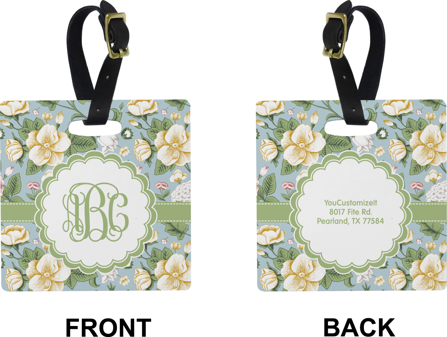 These personalized bag tags are sold in a variety of shapes, so that you may find the product that meets your vision exactly. We sell a round luggage tag, which measures at approximately 4" x 4". Our square luggage tag is about 3.5" x 3.5", while our rectangular version is 2.75" x 4 ".