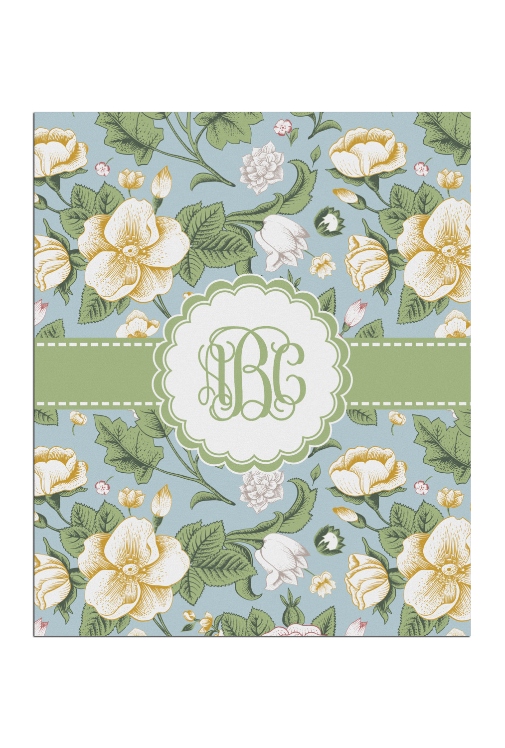The vintage flowers in this design are cream colored magnolias, surrounded by olive green leaves on a demure blue background. The design has a classic ribbon in olive green trimmed in white. The decorative scalloped label is in white and is the perfect place for your monogram for that personal touch to pull the entire design together.