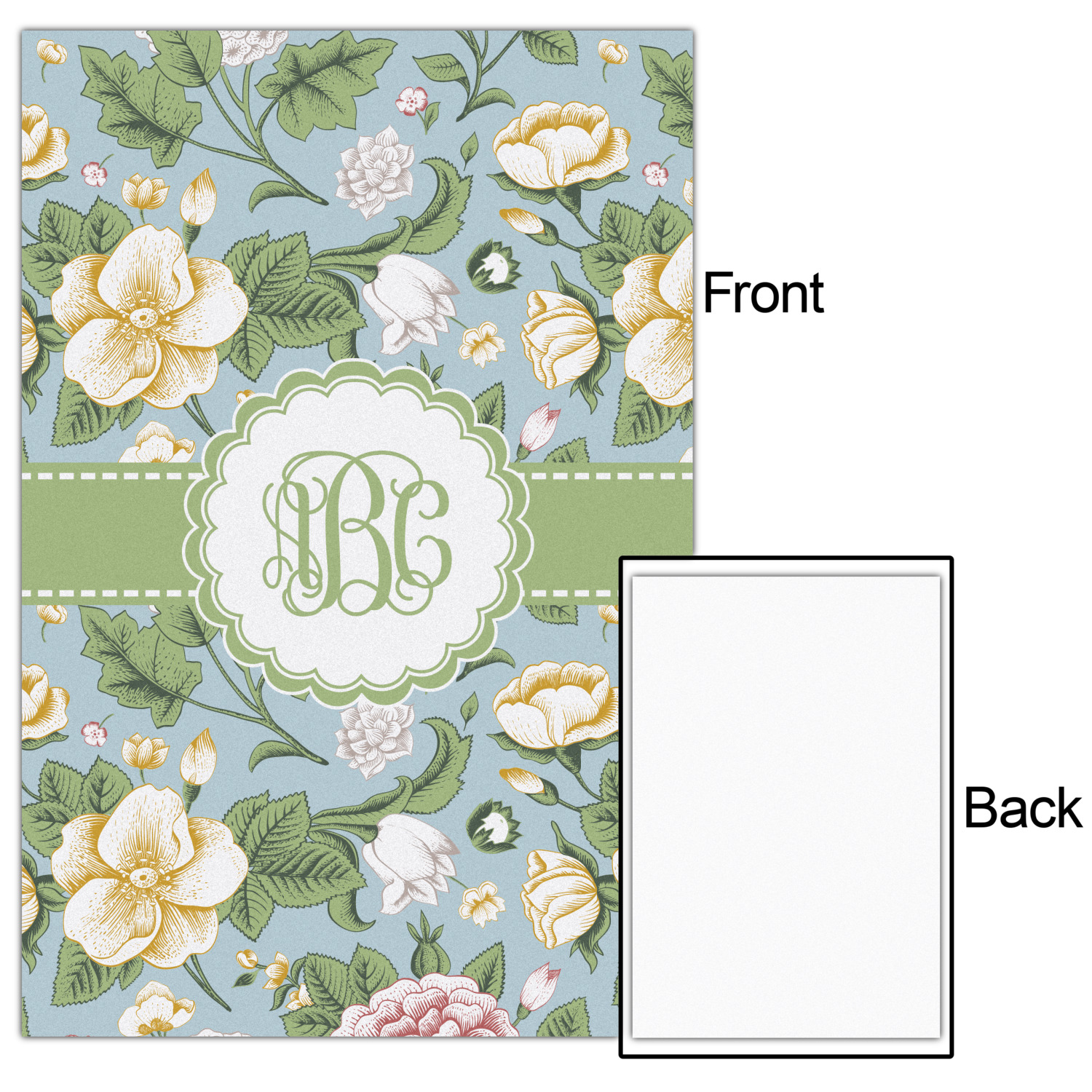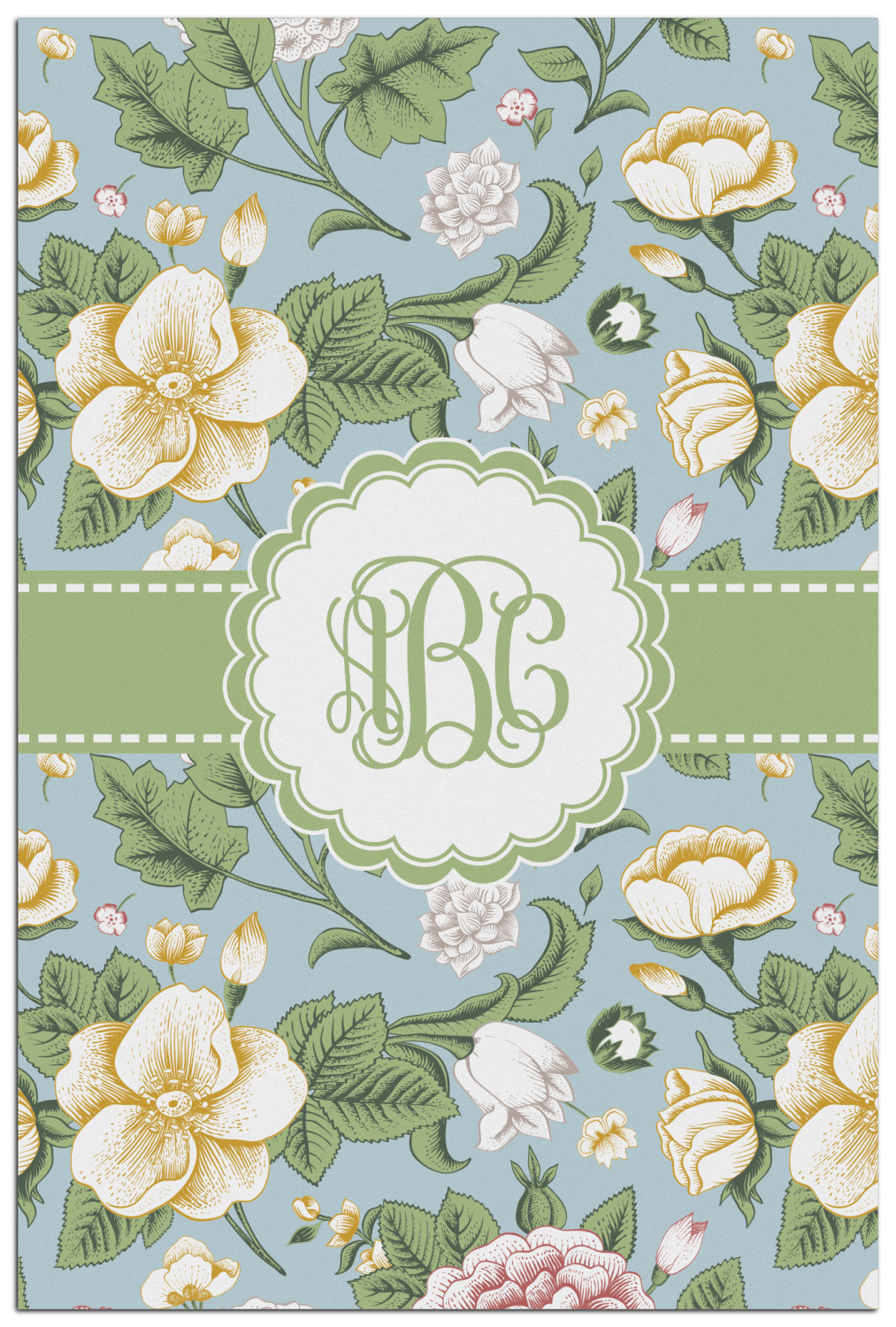 The vintage flowers in this design are cream colored magnolias, surrounded by olive green leaves on a demure blue background. The design has a classic ribbon in olive green trimmed in white. The decorative scalloped label is in white and is the perfect place for your monogram for that personal touch to pull the entire design together.