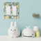 The vintage flowers in this design are cream colored magnolias, surrounded by olive green leaves on a demure blue background. The design has a classic ribbon in olive green trimmed in white. The decorative scalloped label is in white and is the perfect place for your monogram for that personal touch to pull the entire design together.