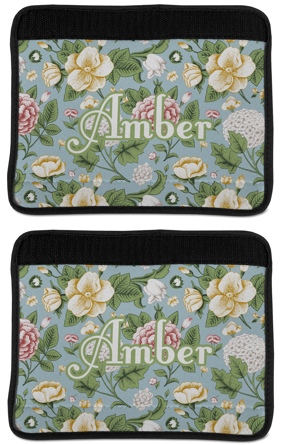 Made from neoprene, our seat belt strap covers wrap around the belt itself and have a Velcro tab for easy attachment and closure. The belt's edges are trimmed with a black polyester for a secure finish. Each cover is 9.5 by 7 inches when open and 9.5 by 2.5 inches when closed. We print your personalized design on the face of the seat belt pad.