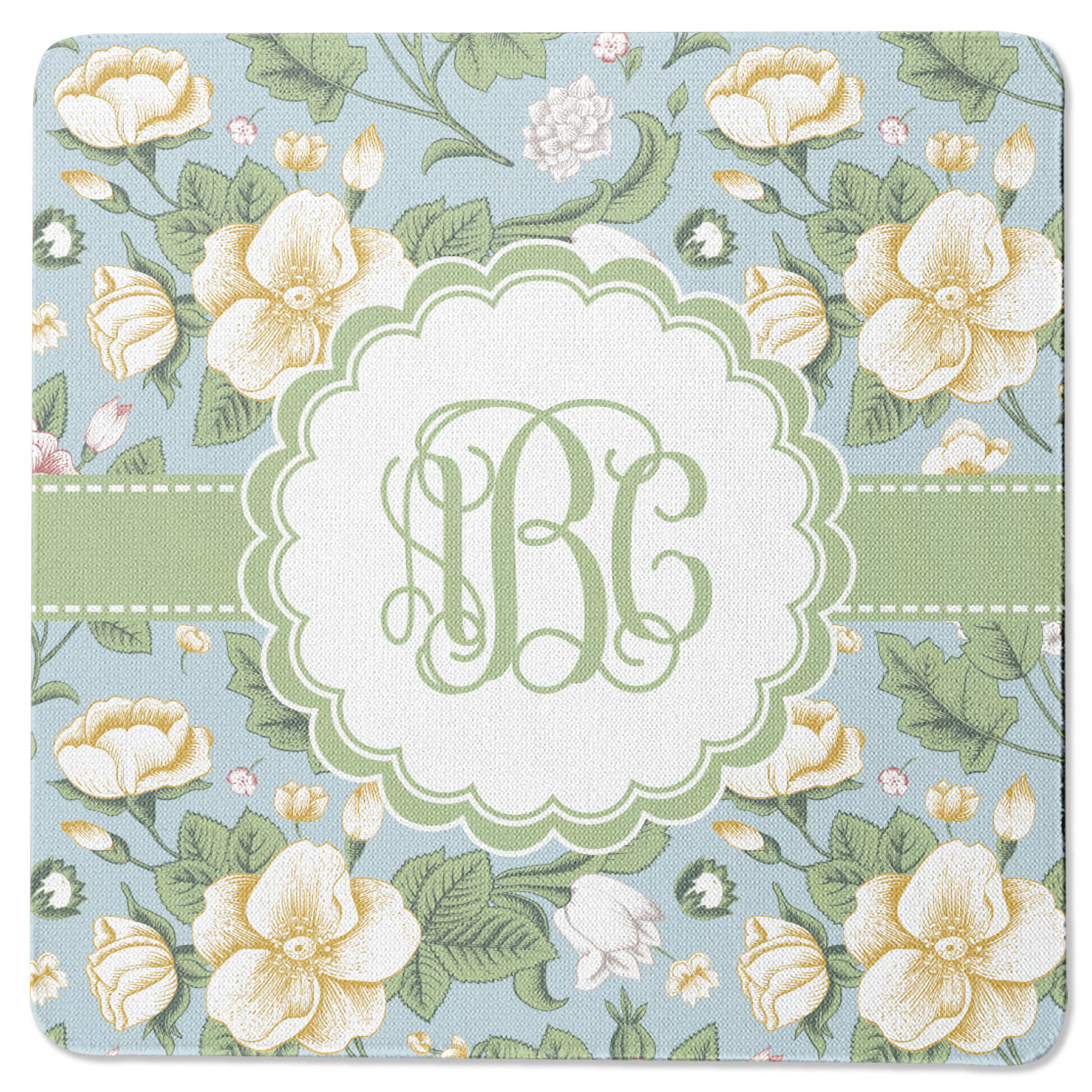 The vintage flowers in this design are cream colored magnolias, surrounded by olive green leaves on a demure blue background. The design has a classic ribbon in olive green trimmed in white. The decorative scalloped label is in white and is the perfect place for your monogram for that personal touch to pull the entire design together.