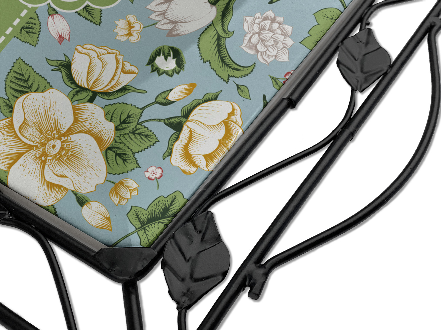 Our square trivets are made from a durable, wrought iron. This model features 4 small half circles, one on each corner, and a larger ring of iron that circles the central, customized tile. Each of the 4 corners has a round foot on its bottom for stability. This trivet is 8.75 by 8.75 inches, but the central tile measures at 6 inches on both sides.