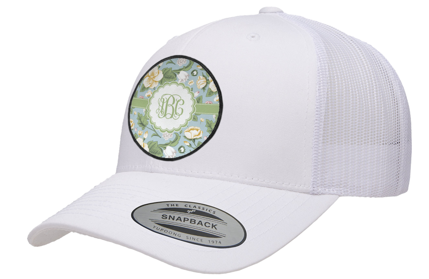 The vintage flowers in this design are cream colored magnolias, surrounded by olive green leaves on a demure blue background. The design has a classic ribbon in olive green trimmed in white. The decorative scalloped label is in white and is the perfect place for your monogram for that personal touch to pull the entire design together.
