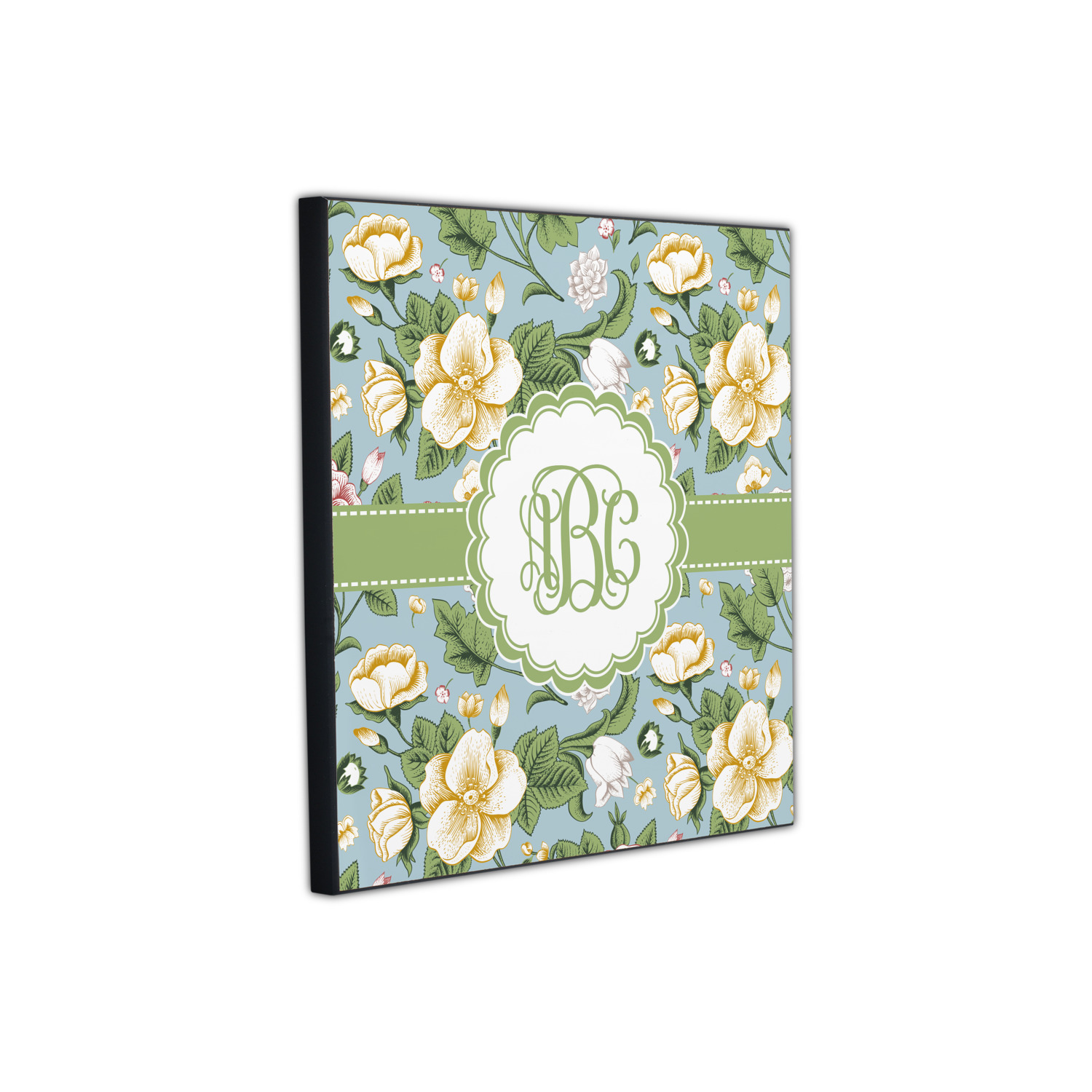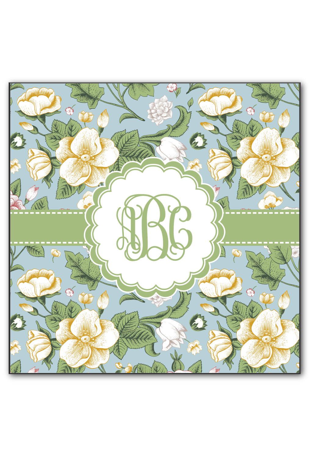 The vintage flowers in this design are cream colored magnolias, surrounded by olive green leaves on a demure blue background. The design has a classic ribbon in olive green trimmed in white. The decorative scalloped label is in white and is the perfect place for your monogram for that personal touch to pull the entire design together.
